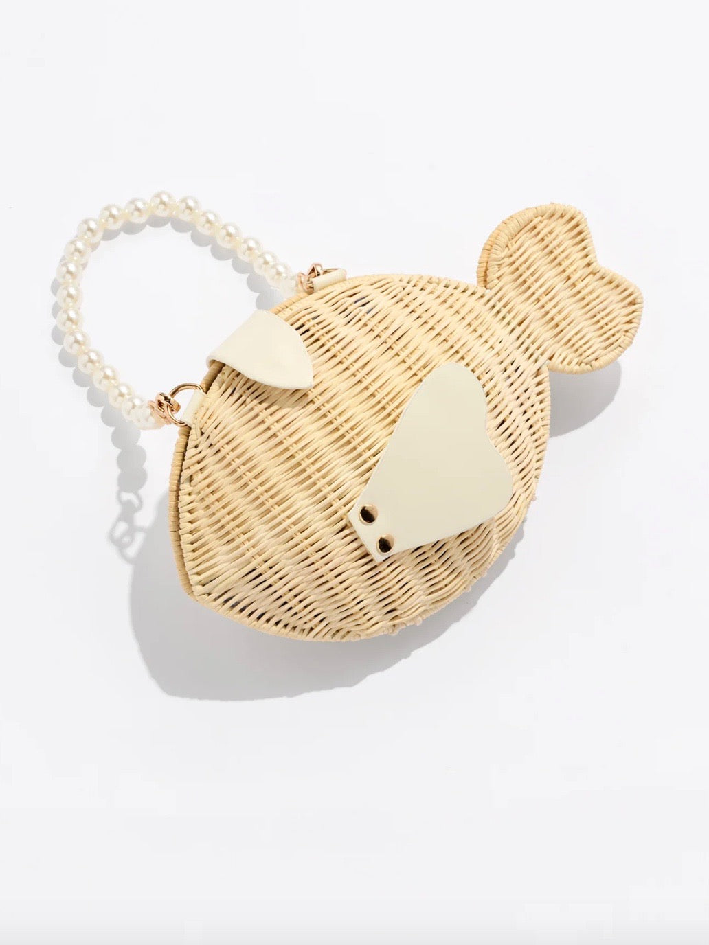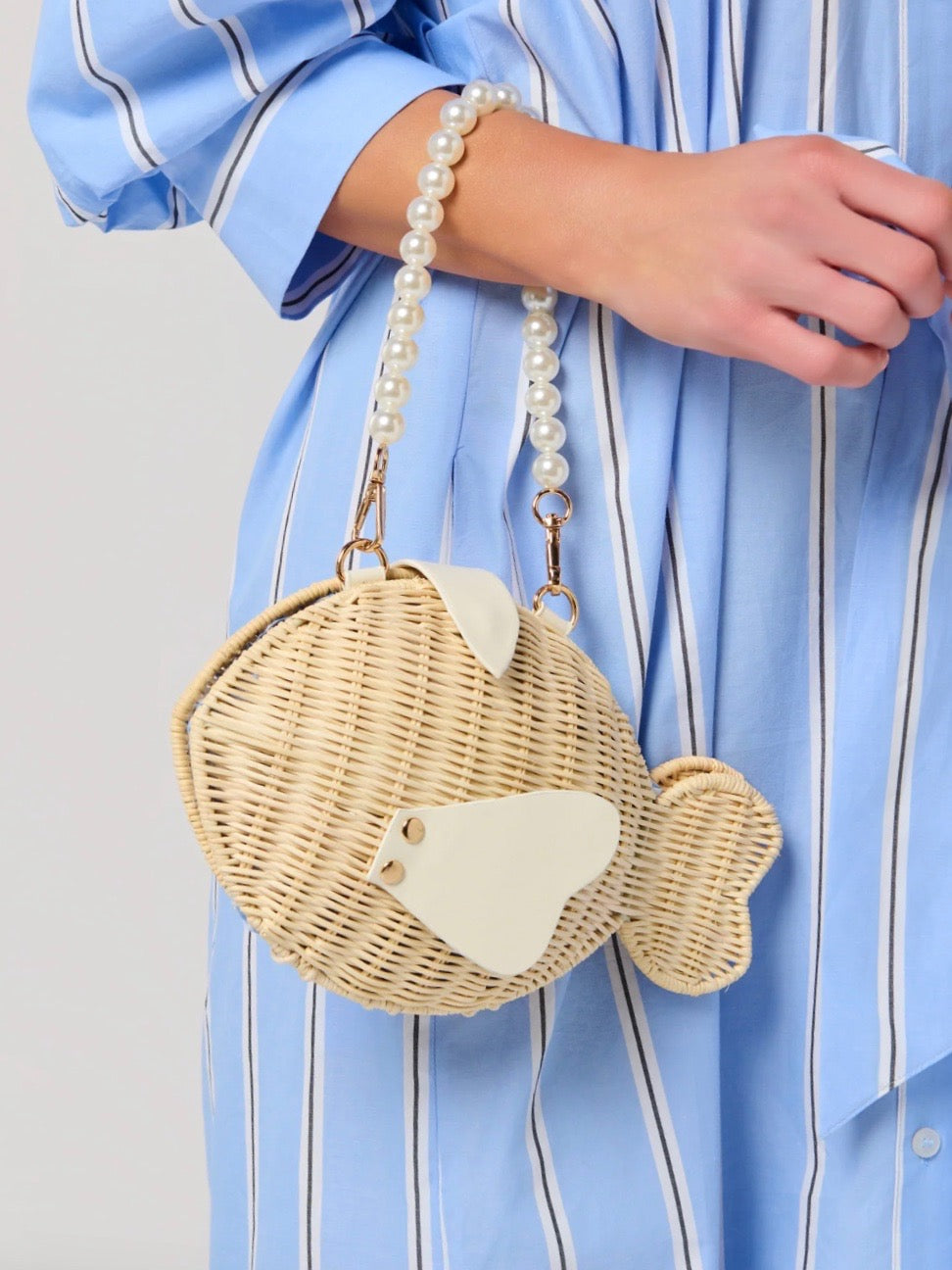 Make waves with the Marina Fish Bag, a whimsical statement piece that's as fun as it is functional. Shaped like a charming fish, this woven bag features a magnetic snap closure and a single detachable pearl handle for versatile styling. Soft vegan leather fins add a playful touch, while a gingham-lined interior keeps your essentials secure. Whether you're headed to the boardwalk or brunch, this bag is ready to swim into your summer wardrobe.