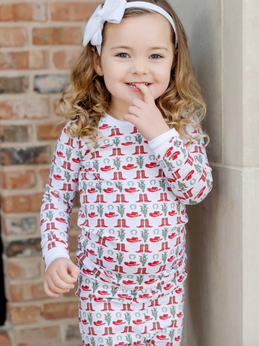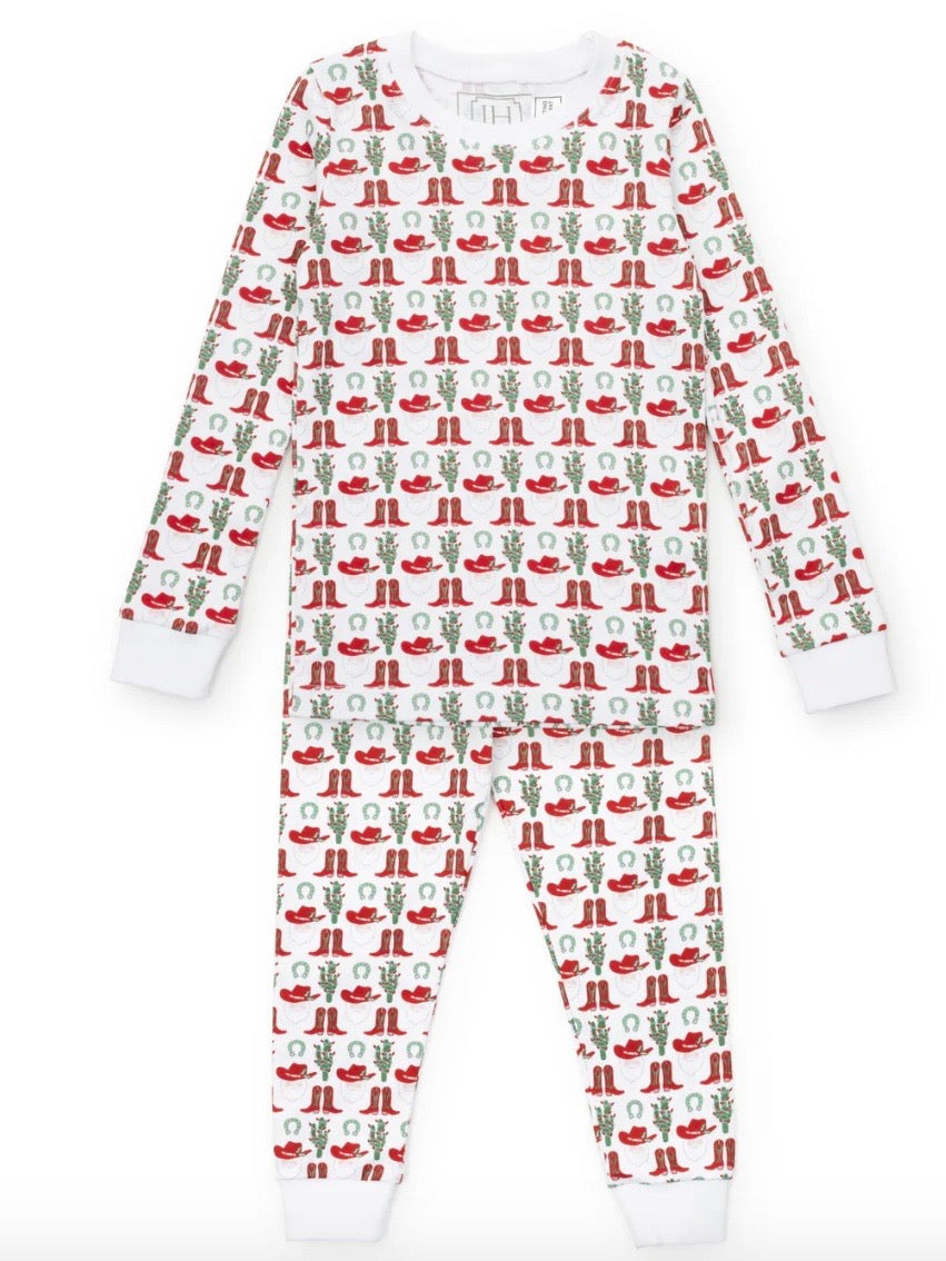 Pima cotton long sleeved pajama top and pant set. Pants have an elastic waistband. Made from 100% Peruvian Cotton. Our pajamas are designed with care and in compliance with CPSC safety standards. They are free from flame-retardant chemicals and are not flame resistant, so they are made to fit snugly.