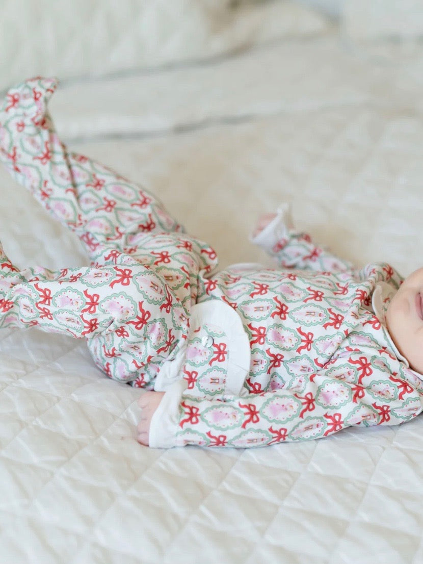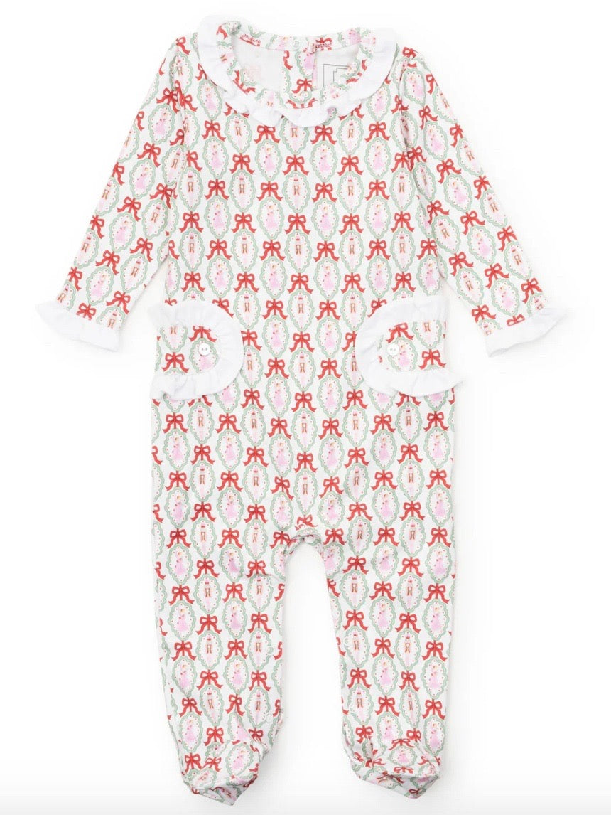 Long sleeved pima cotton footed onesie with ruffles around neck, collar and side plackets. Snaps in stride and back of neck.