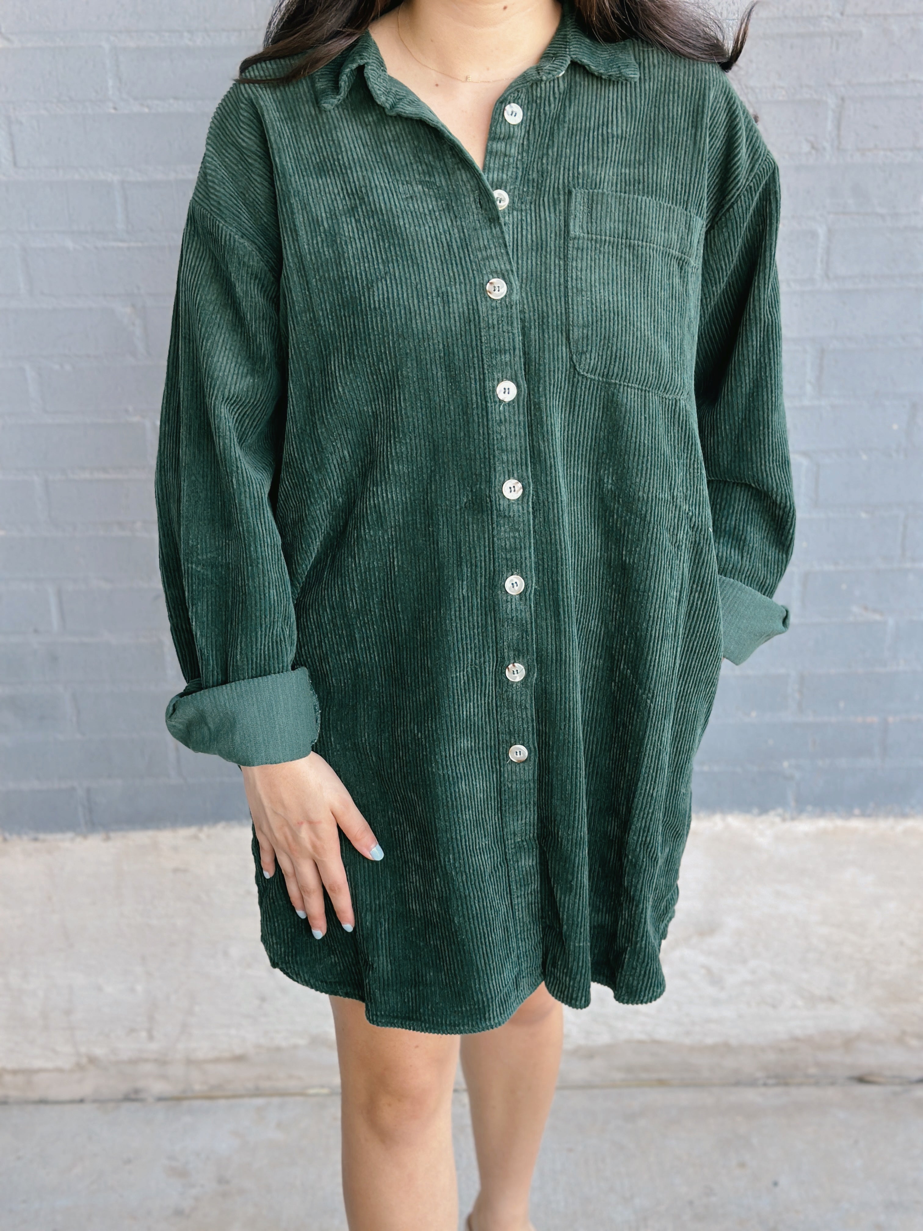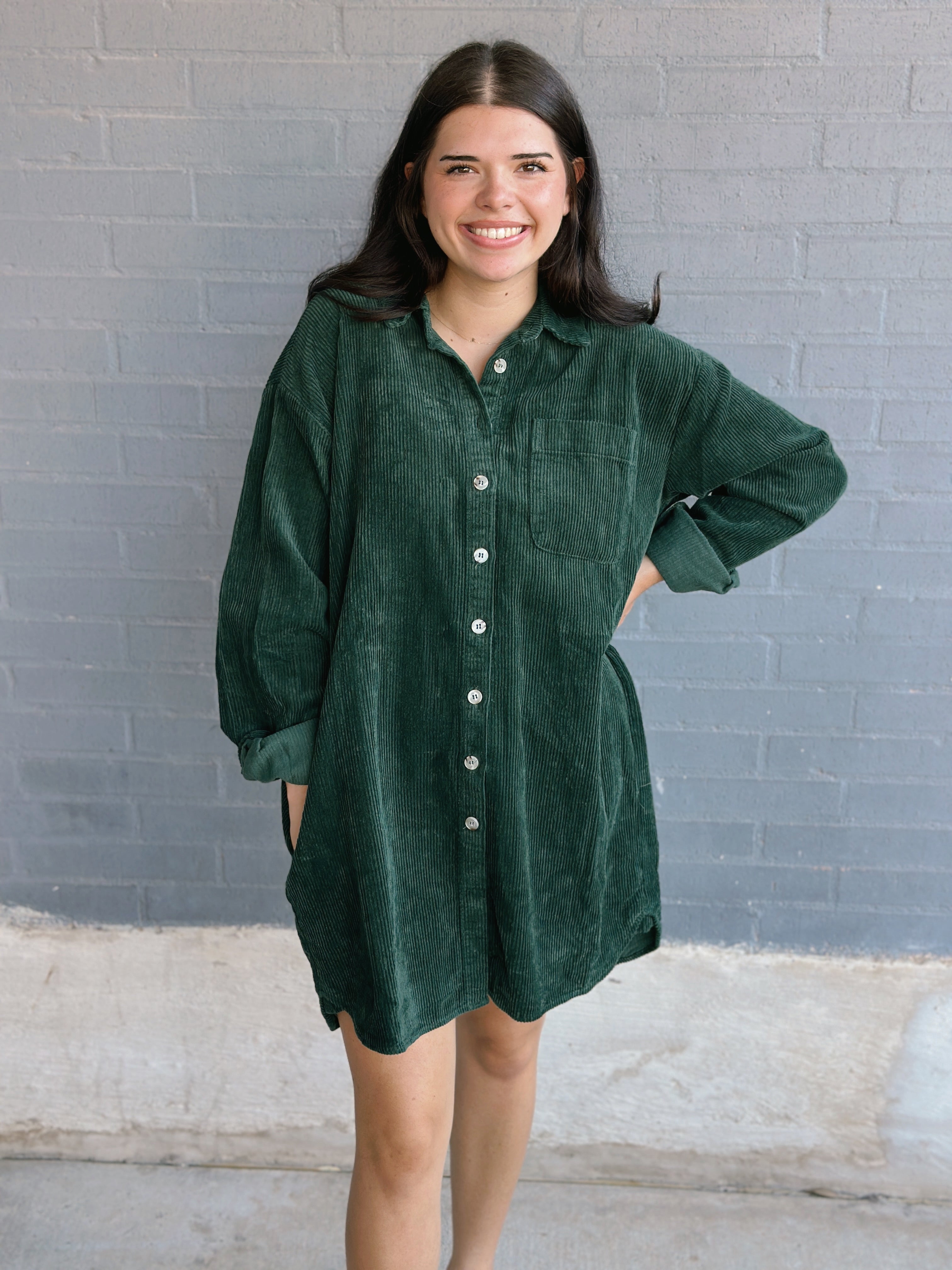 Step into fall with the All Aboard Dress, a corded button-down style that’s ready for crisp autumn days. Pair it with knee-high boots for a look that’s effortlessly chic and perfectly cozy.