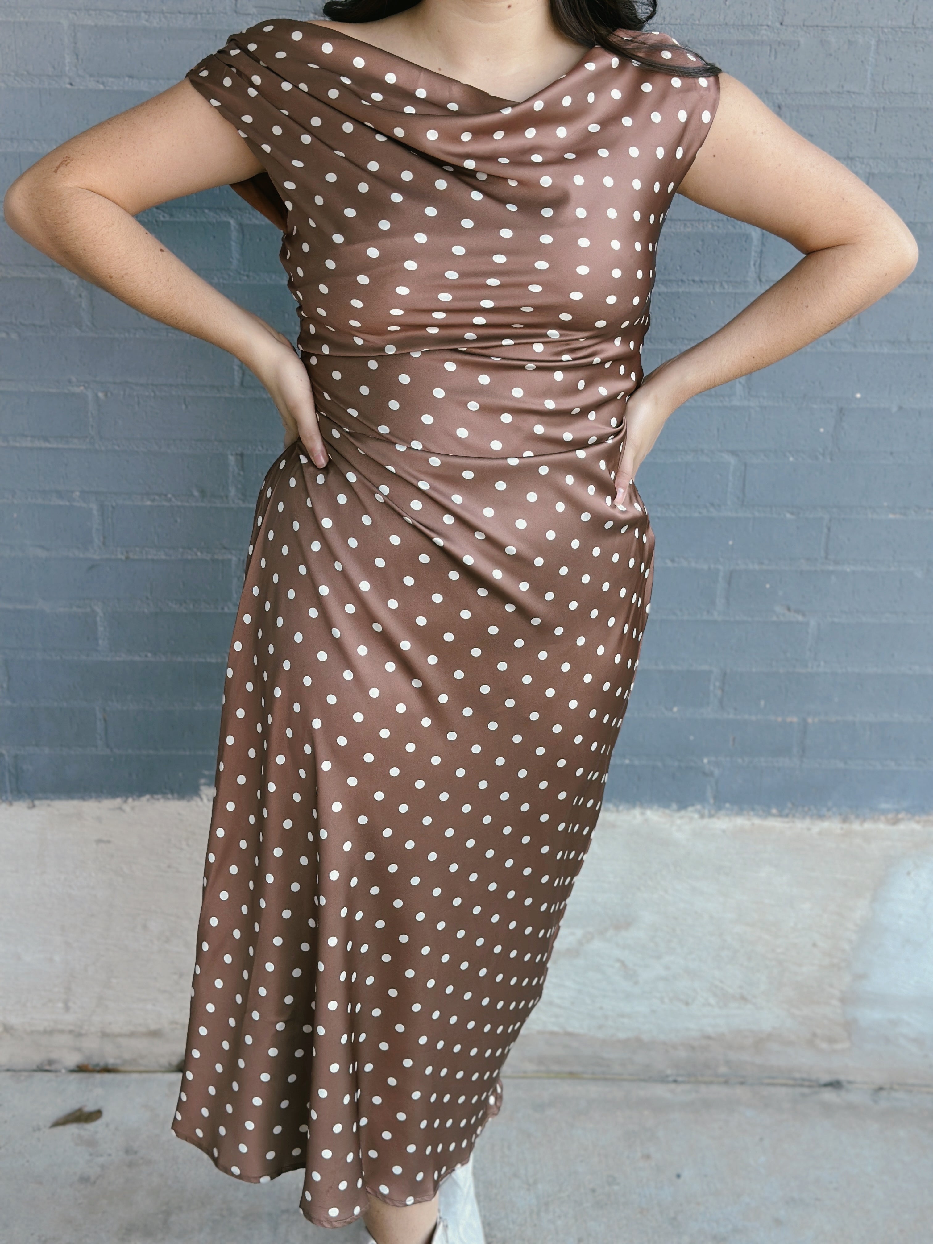 Step into the spotlight with the Be So For Real Dress, where vintage charm meets modern flair. This sleek maxi features a flattering cowl neckline and graceful flare silhouette that moves with you. Crafted from luxurious woven polyester satin adorned with playful polka dots, it's lined with soft rayon for comfort against your skin.