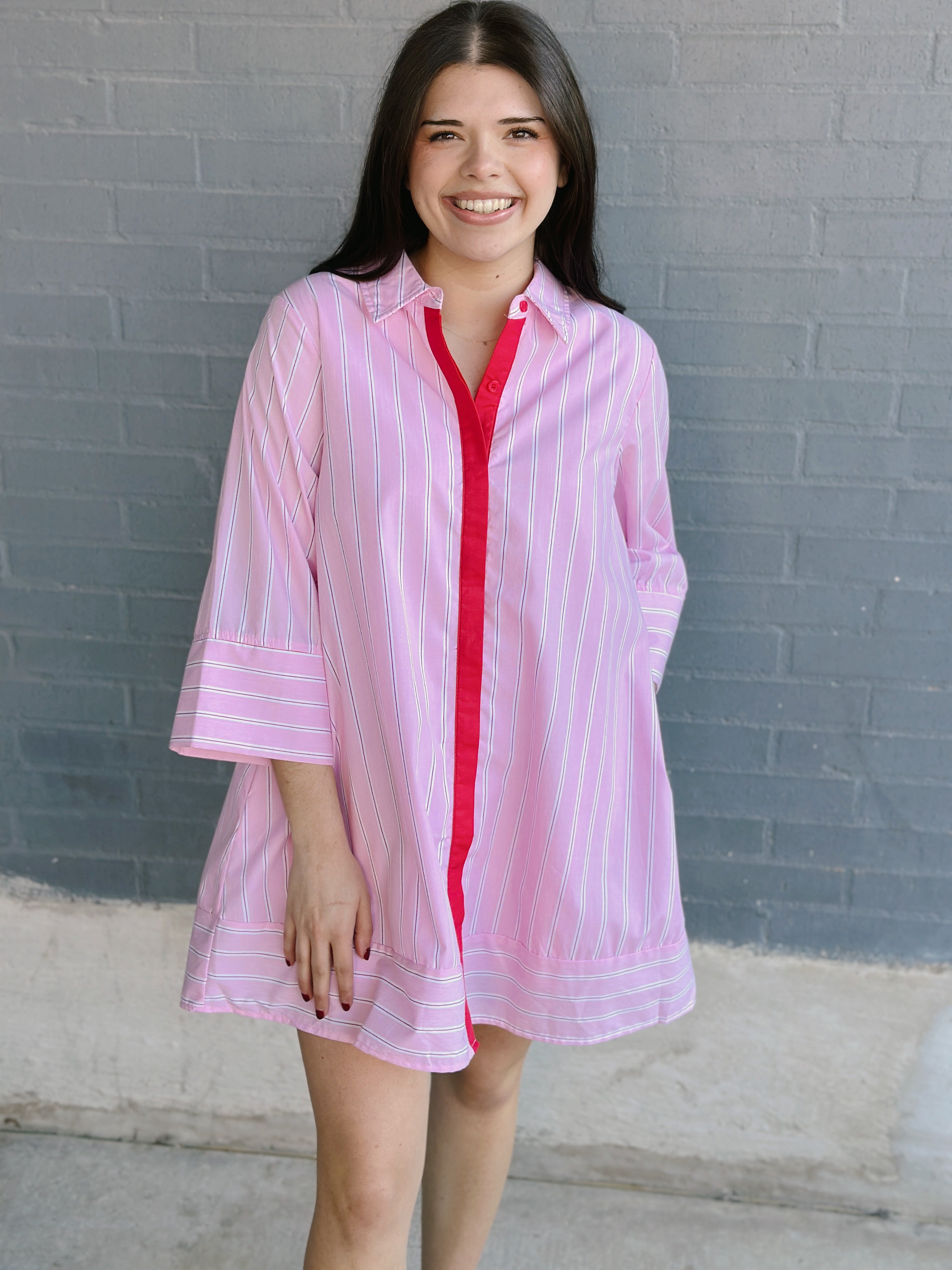The Callum Dress is your new go-to for effortless charm. This fun and flirty pink number features a crisp collared neckline that adds a touch of preppy polish to its playful vibe.
