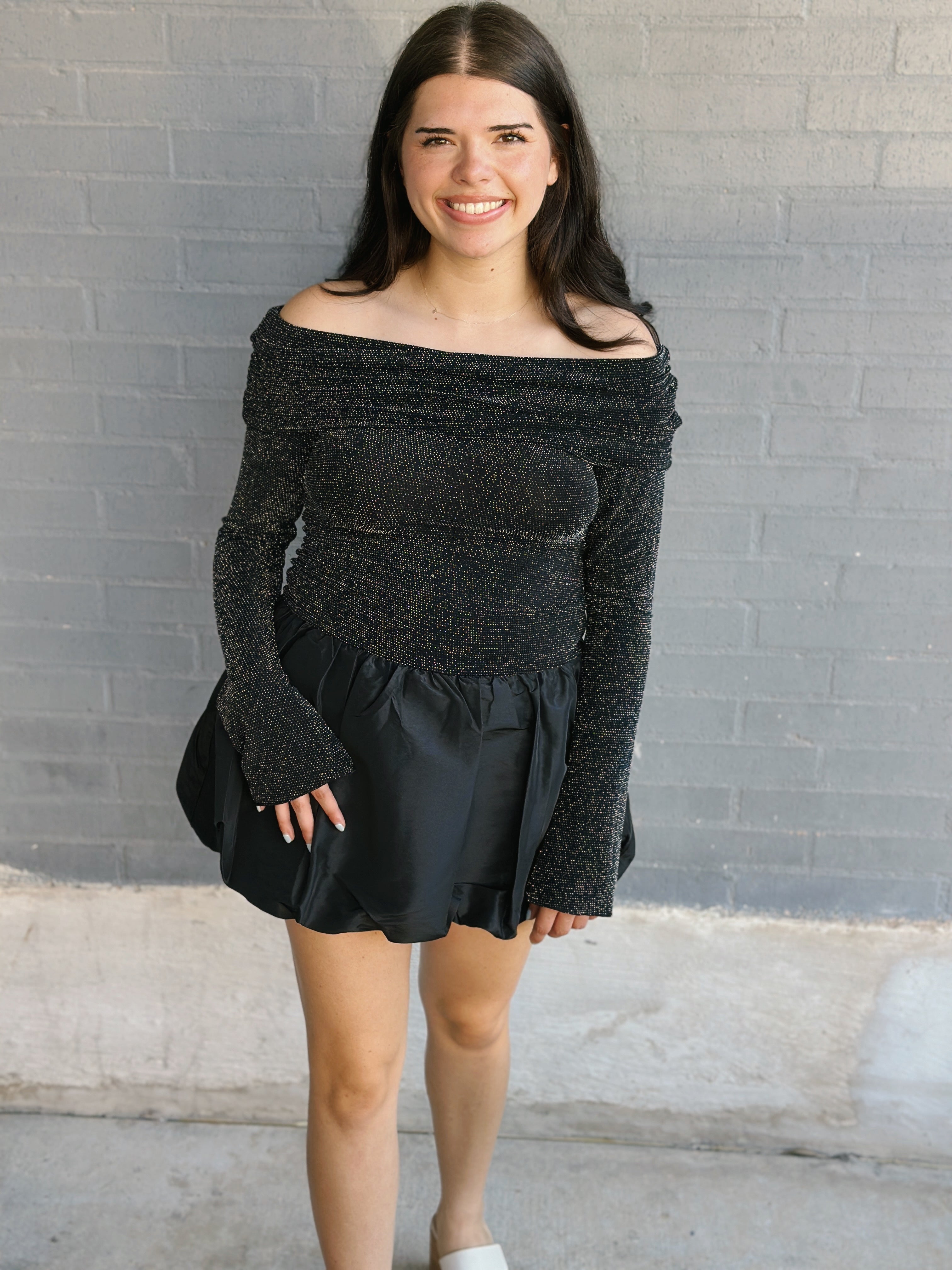 Get party ready in the Show Me Your Mumu™ Charlize Mini Dress! With a trendy off-the-shoulder rolled down neckline and contrast bubble hem skirt, it looks too pretty. Featuring long sleeves and a short and sweet above-the-knee silhouette, this mini dress keeps you ready for your next event. Fun shimmer fabric for the bodice elevates the style quotient.