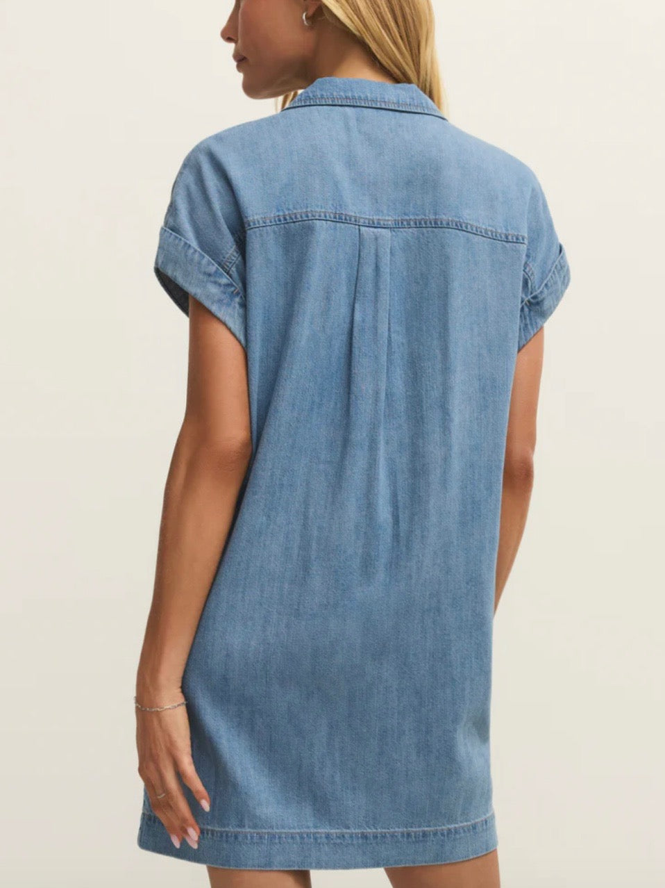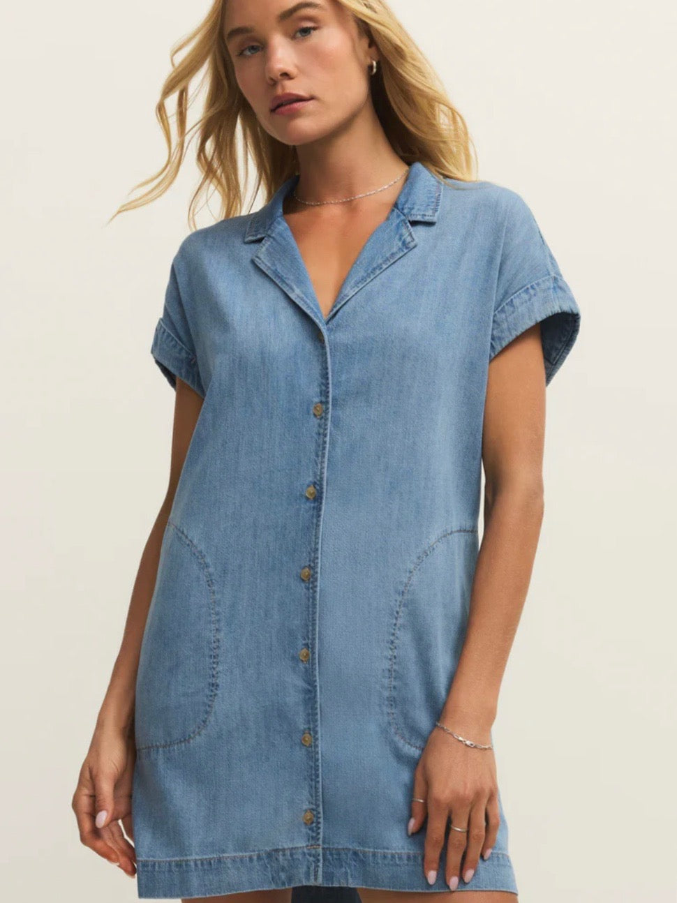 This mini denim dress is as soft as it is effortless. It’s a timeless closet staple with its button front, side seam pockets, and collar detail.