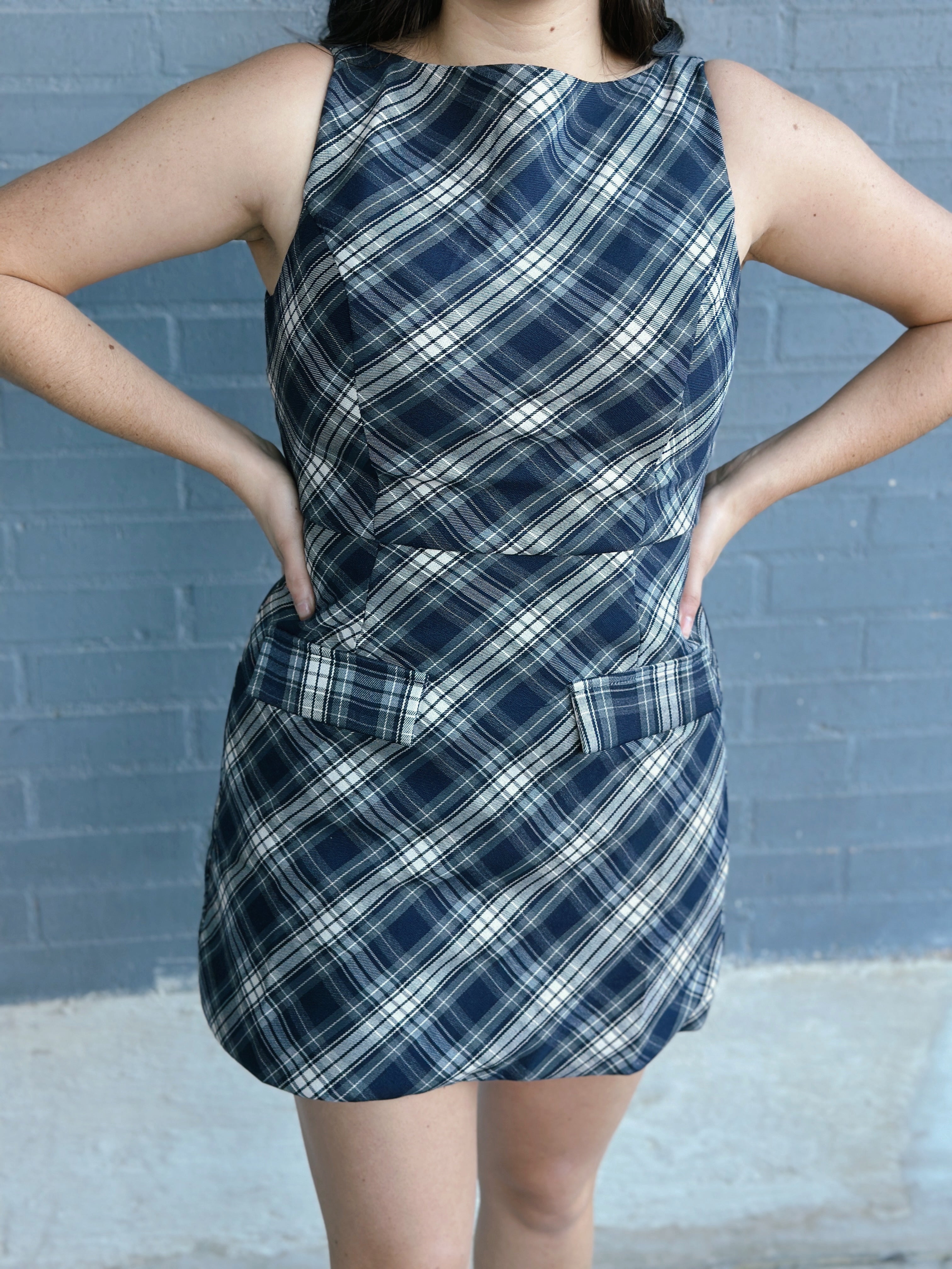 A chic twist on a timeless classic, this navy plaid mini brings preppy charm with a modern edge. Cut in a tailored sleeveless silhouette, it features a flattering shift shape with faux pocket flaps that add a touch of polish.