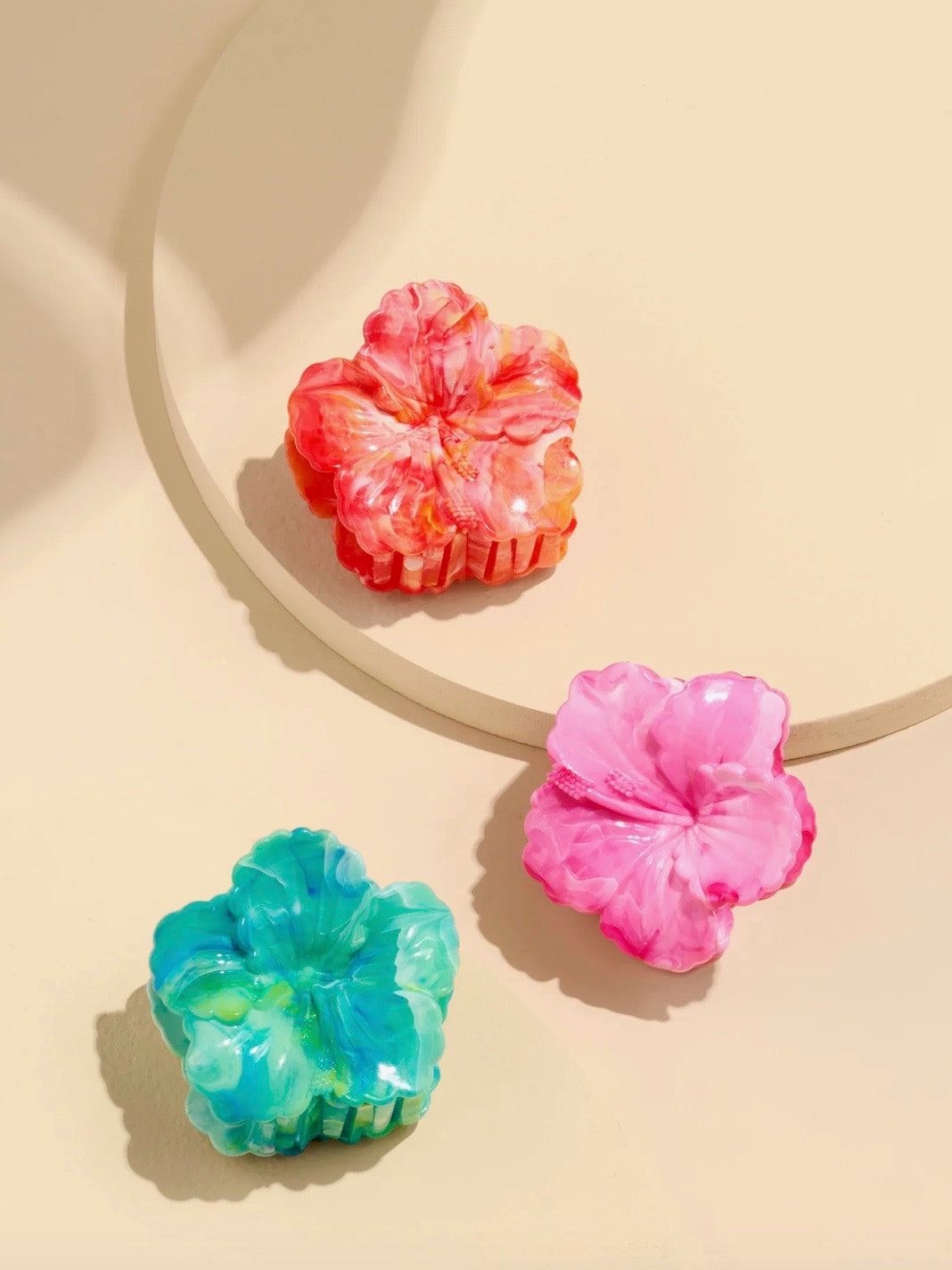 Add a splash of island charm to your hair with our Hibiscus Claw Clip. Designed in a vibrant floral silhouette, this clip brings tropical flair to any look. Available in dreamy shades of green, pink, and orange, each clip has a glossy marbled finish that mimics real hibiscus petals. It's the perfect accessory for beach days, brunch dates, or just adding a pop of paradise to your everyday style.