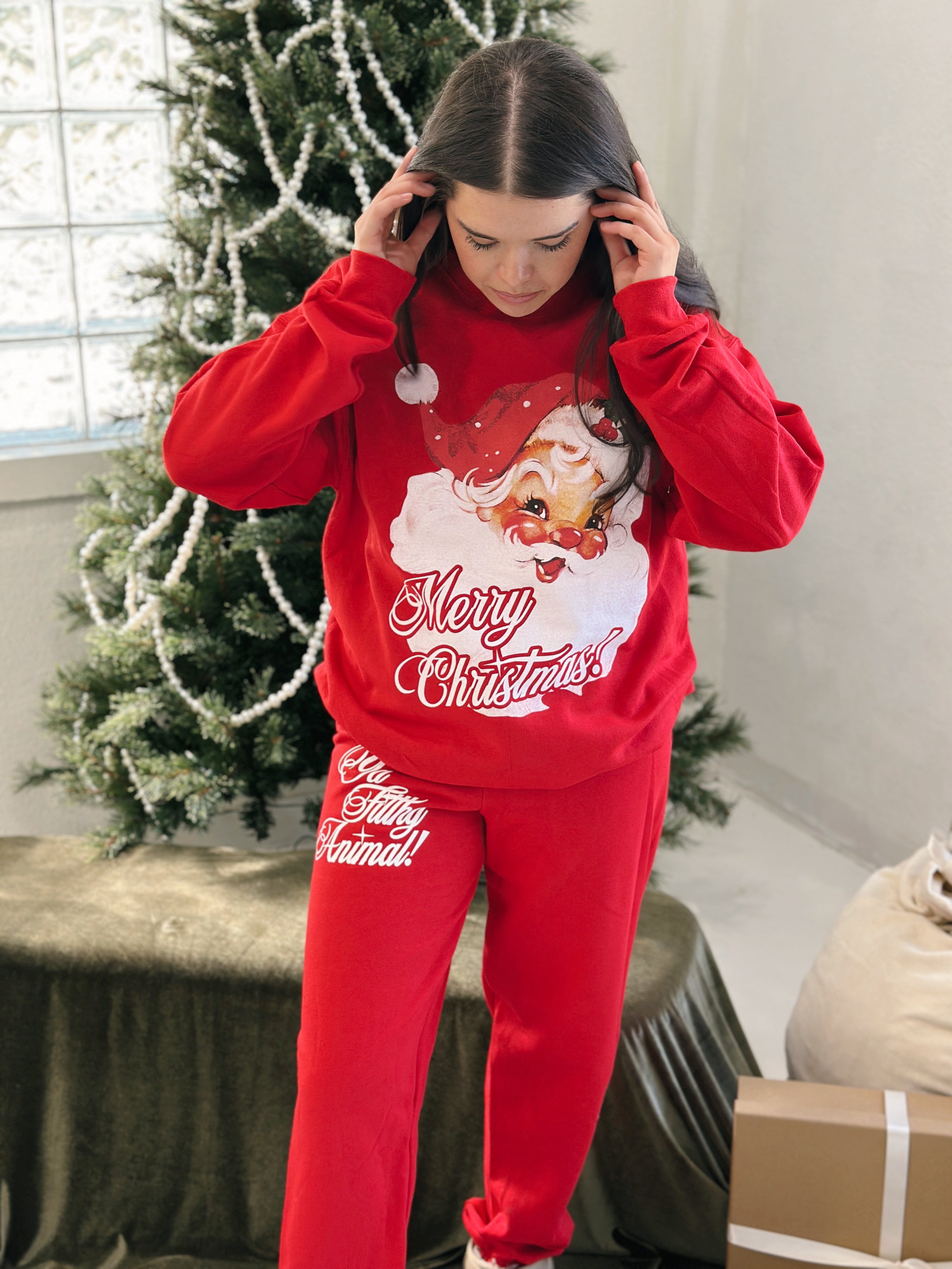 Complete the ultimate holiday set. These red pull-on joggers pair perfectly with the Vintage Santa Crewneck and feature “Ya Filthy Animal” in playful white script - cozy, cheeky, and made for lounging, gifting, or holiday movie marathons.