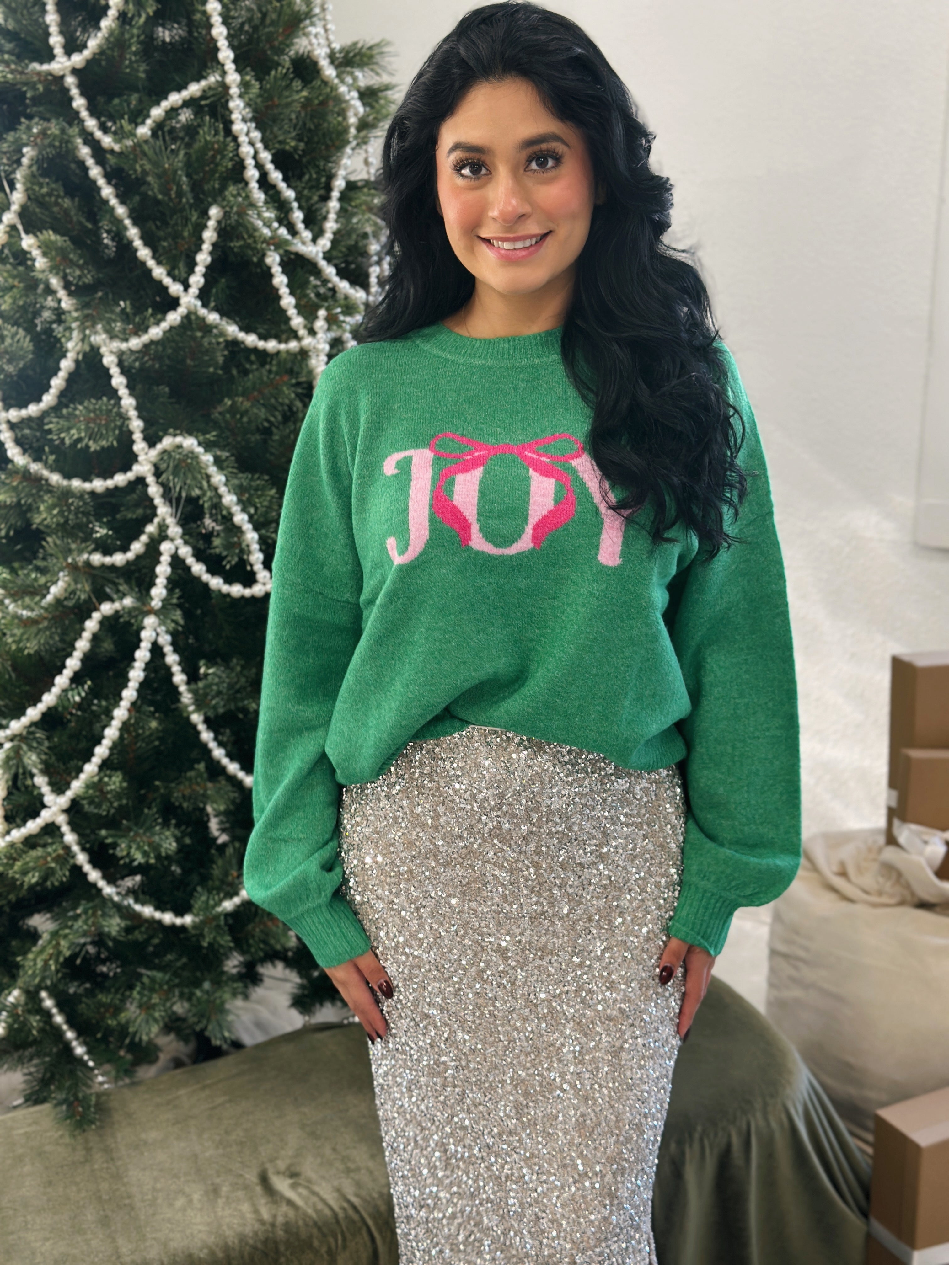 Spread some cheer with the "Joy" Sweater, a festive favorite that’s as merry as it is chic. Featuring the word “Joy” in playful lettering with a pink bow in place of the “O,” this green pullover brings holiday vibes with a fun twist. Made with a soft, cozy knit and a slightly relaxed fit, it’s perfect for sipping champagne or trimming the tree. Whether you're hosting a holiday party or cozying up fireside, this sweater brings the celebration with you.