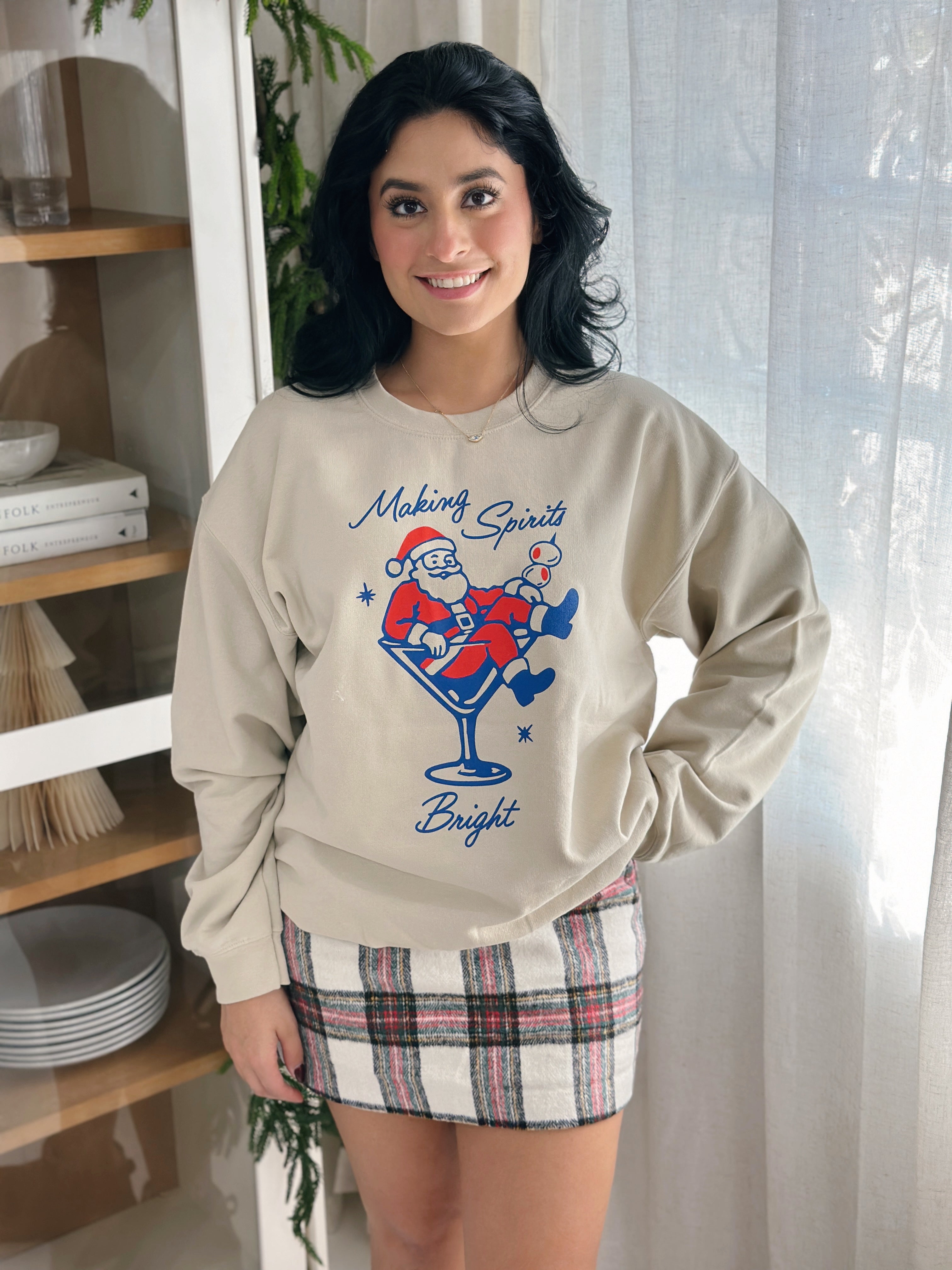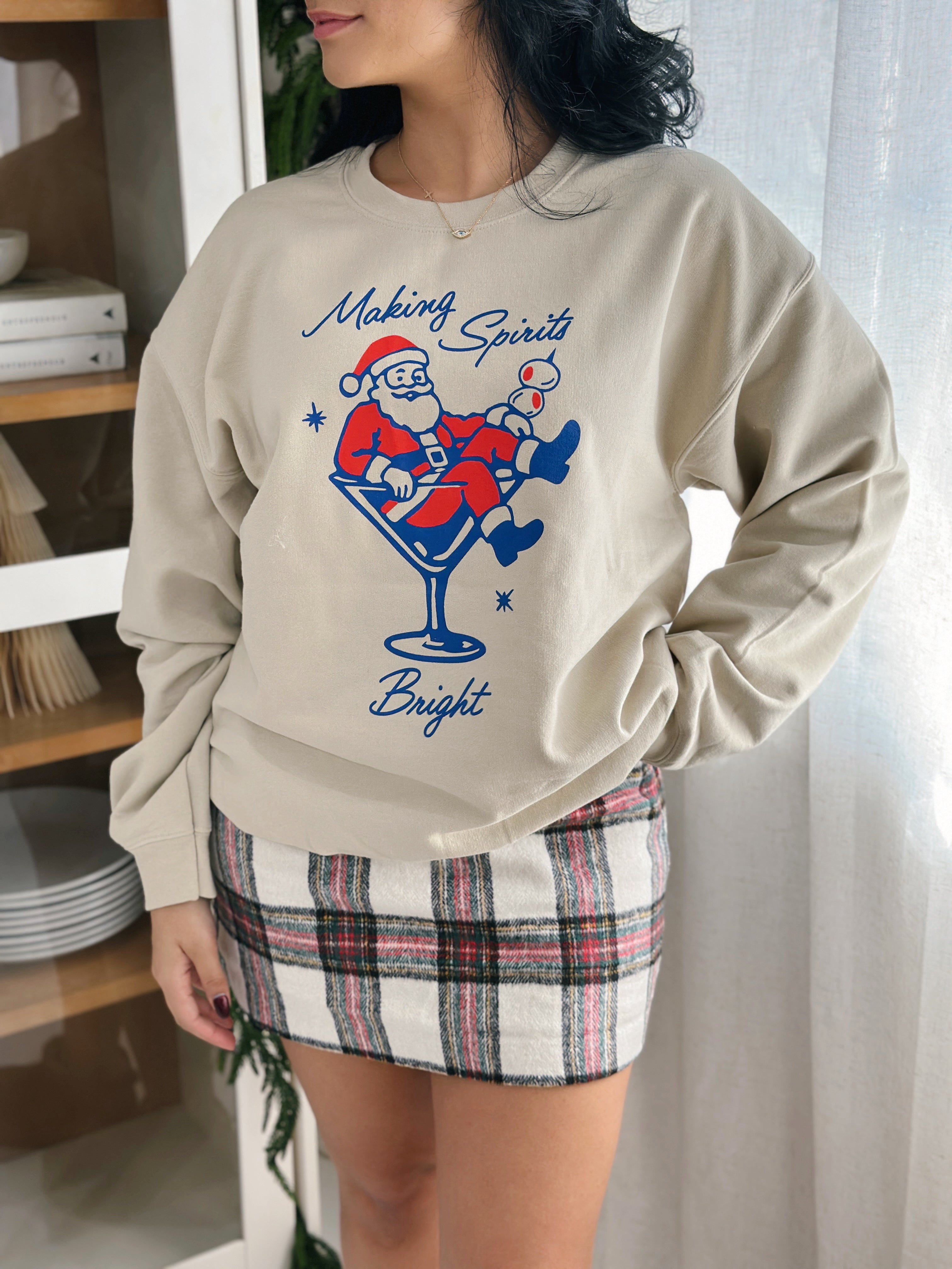 Sip back and relax this holiday season. This cream colored crewneck features jolly old St. Nick lounging in a blue martini glass with “Making Spirits Bright” across the front. A cheeky, cozy twist on holiday style that’s perfect for parties, gifting, or just mixing a little sparkle into your everyday look.