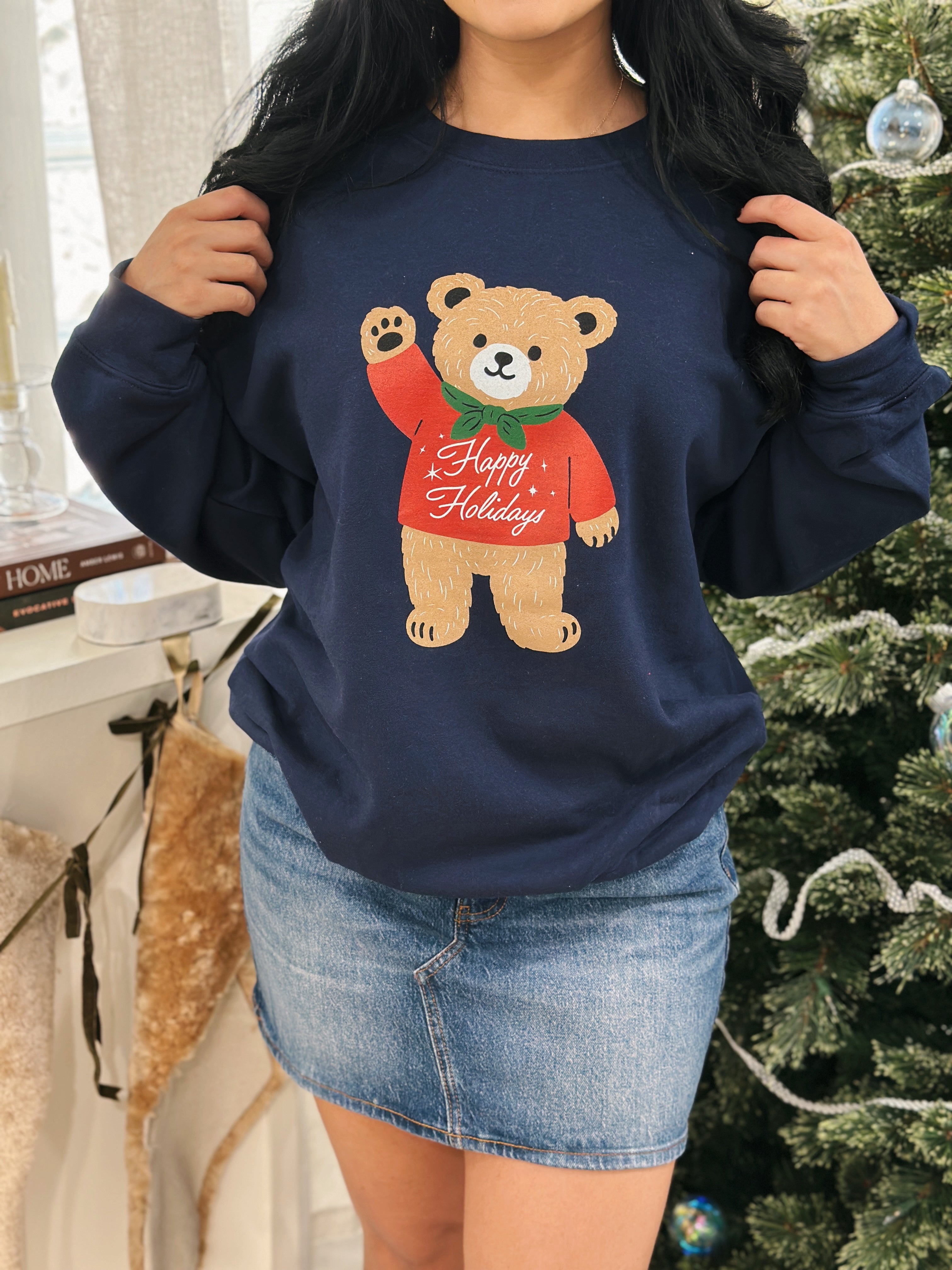 A holiday classic with extra cozy vibes. This navy crewneck features a brown teddy bear sporting a red sweater that says “Happy Holidays” - soft, cheerful, and sure to become a go-to for chilly nights, gift-giving, or spreading festive smiles wherever you go.