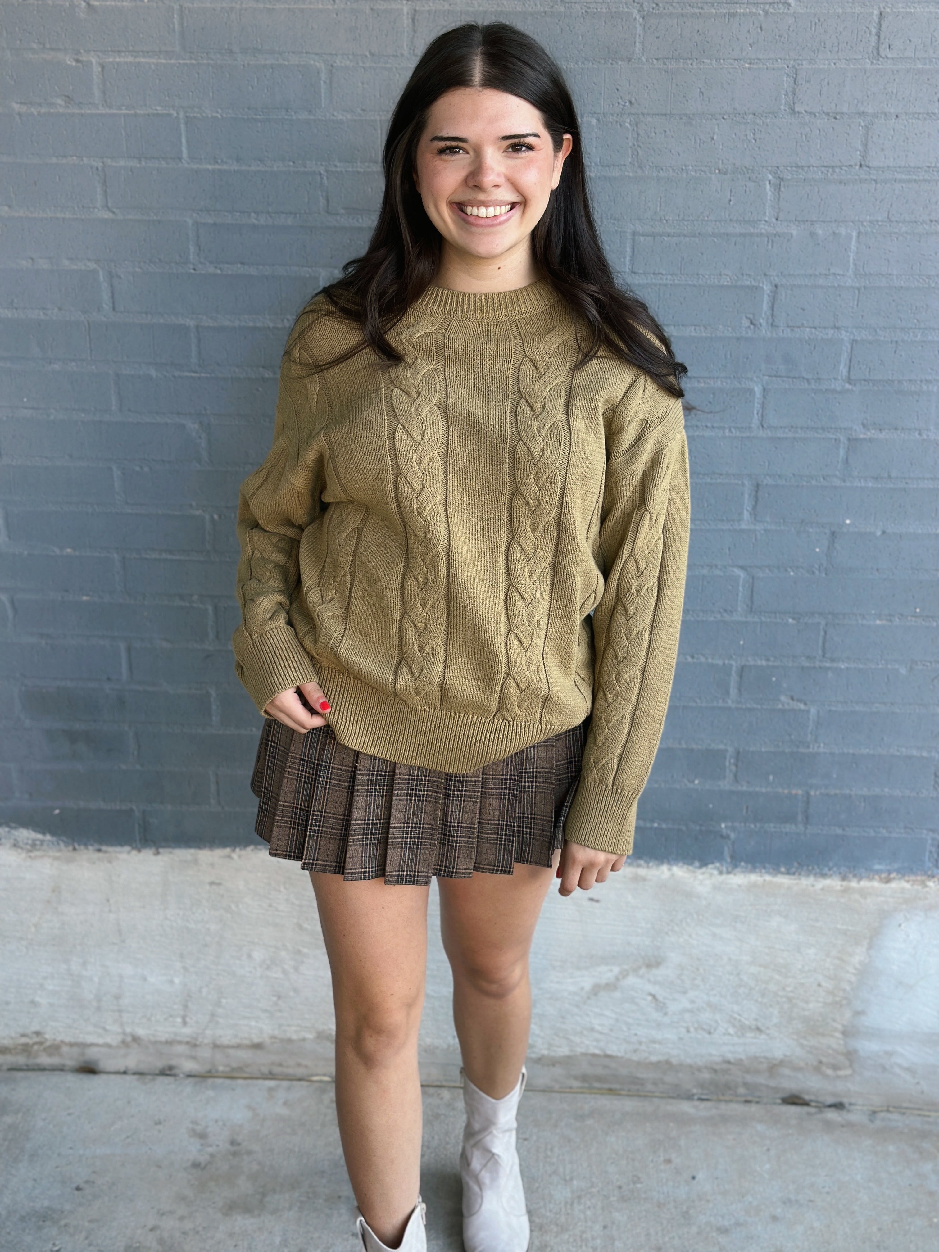 Wrap yourself in cozy comfort with our Olive Jar Sweater—an oversized cable knit dream that's equal parts snug and stylish. The rich olive tone pairs effortlessly with everything in your closet, while the chunky knit texture adds serious visual interest