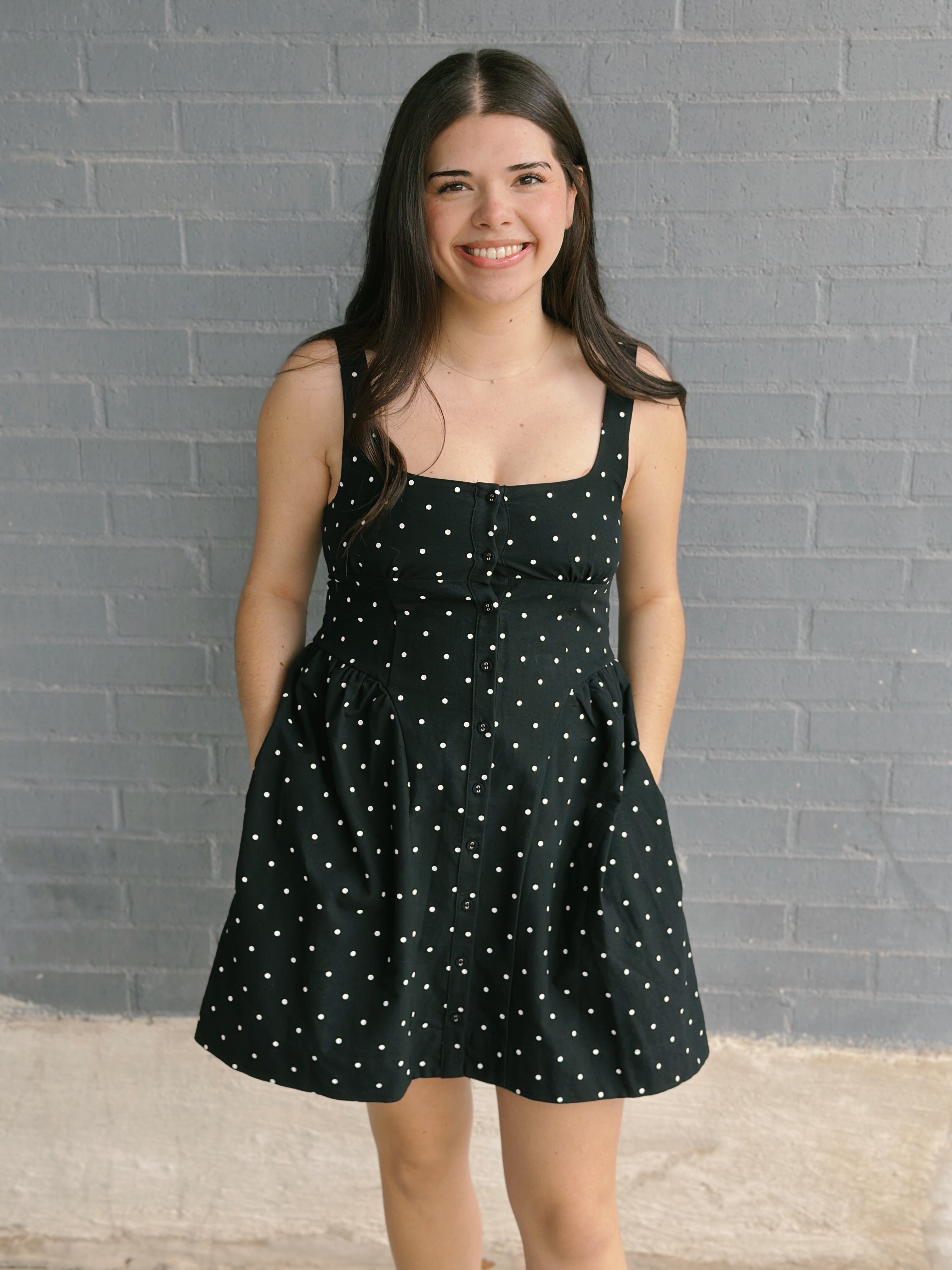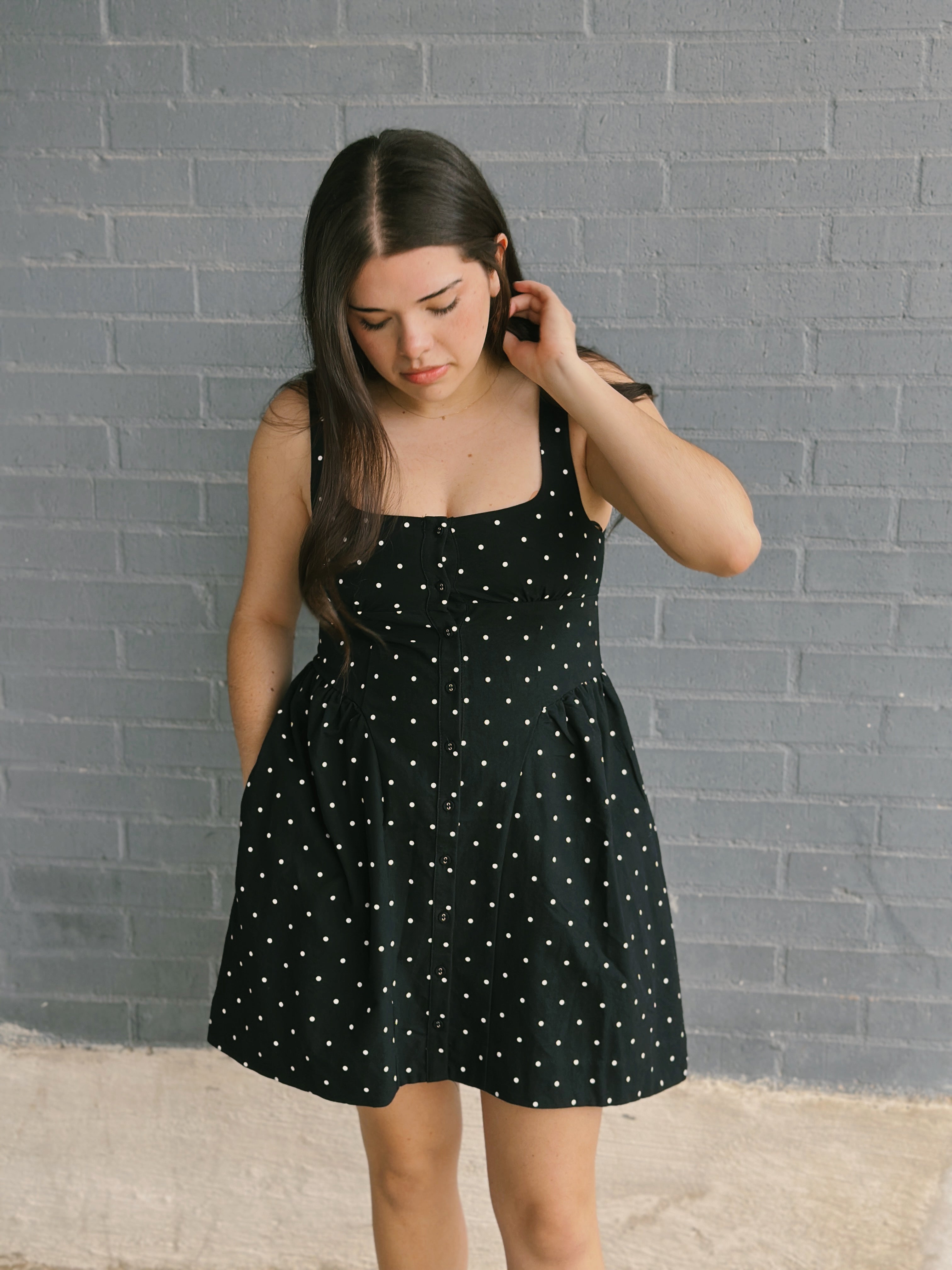 A charming polka-dot mini dress designed with a flattering square neckline and wide straps for a structured yet feminine look. The fitted bodice accentuates the waist, while the softly gathered skirt creates a playful A-line silhouette. Functional front button details add a classic touch, making it perfect for spring to summer styling.