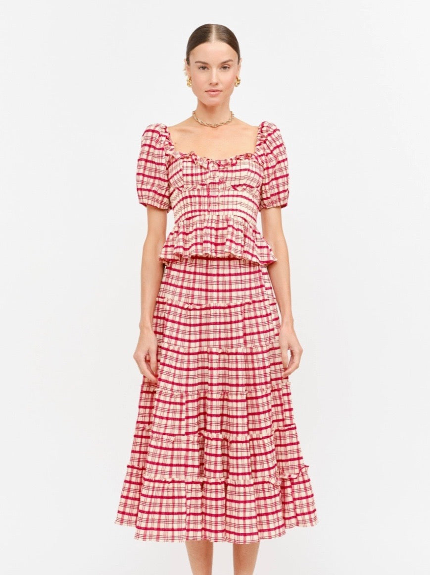 This plaid printed corset-style blouse pairs a romantic square neckline with softly gathered puff sleeves for a sculpted-yet-easy feel. The fitted bodice is detailed with a subtle sweetheart seam and a delicate front tie, while the peplum hem adds movement. Smocked back paneling offers comfortable stretch.