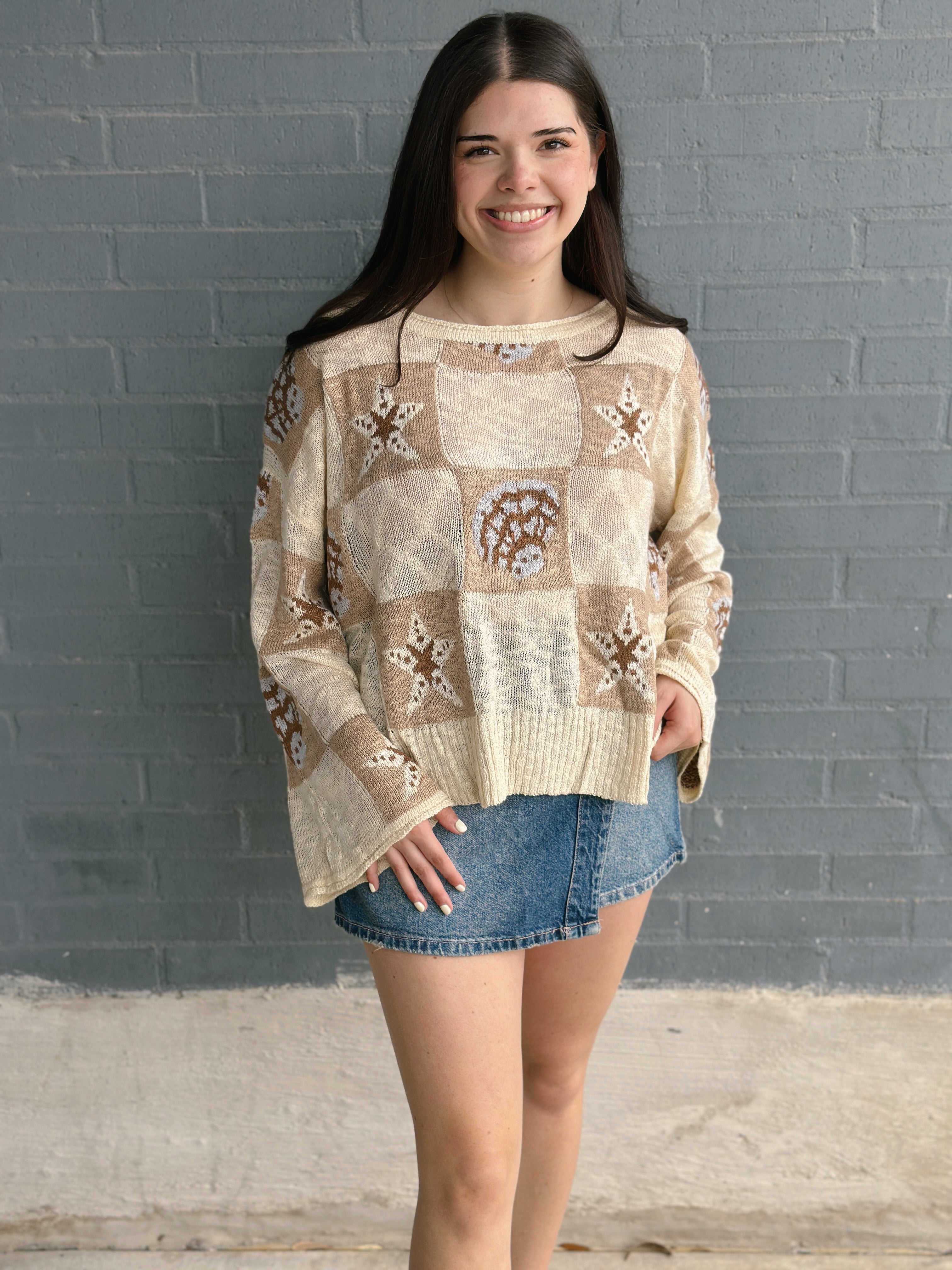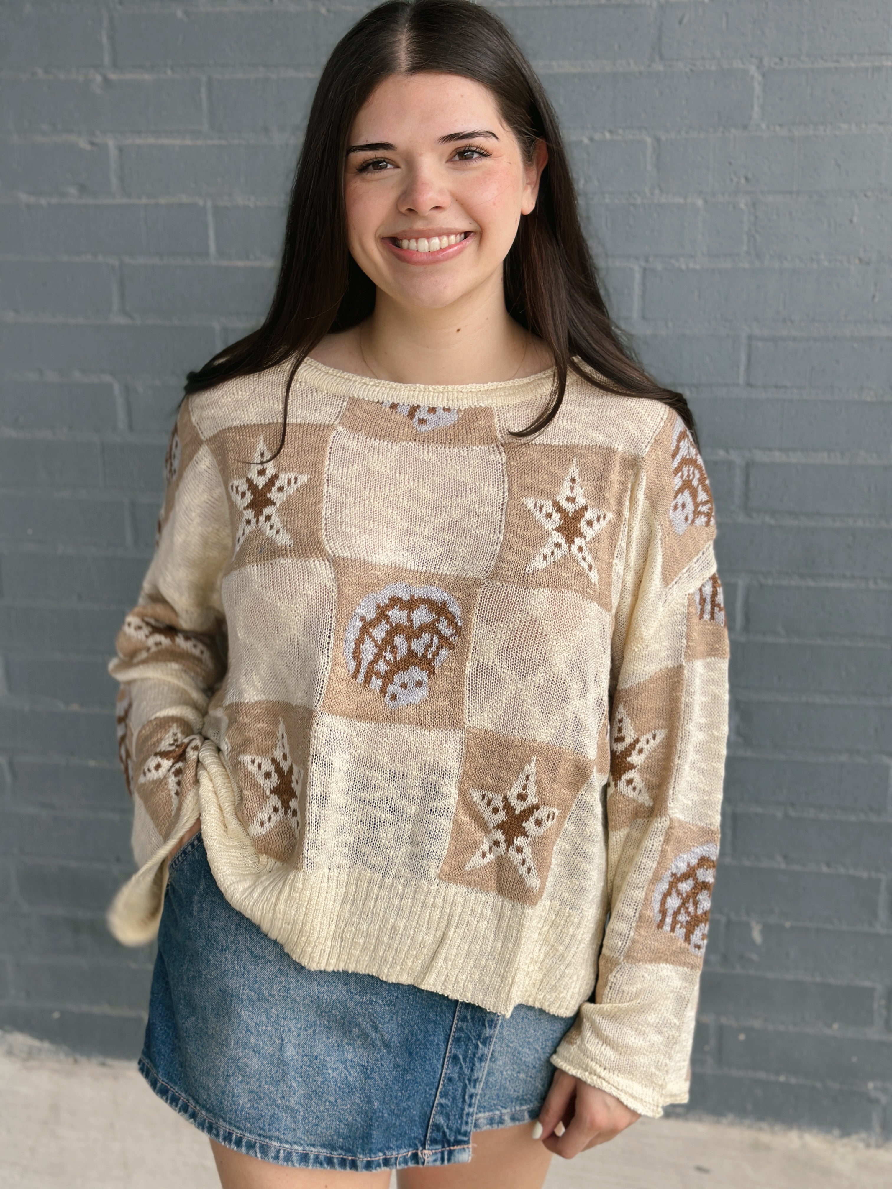 Dive into coastal vibes with this oversized graphic sweater featuring whimsical sea shells and starfish scattered across the front. The relaxed, loose fit makes it perfect for layering on breezy beach days or cozy nights by the fire.