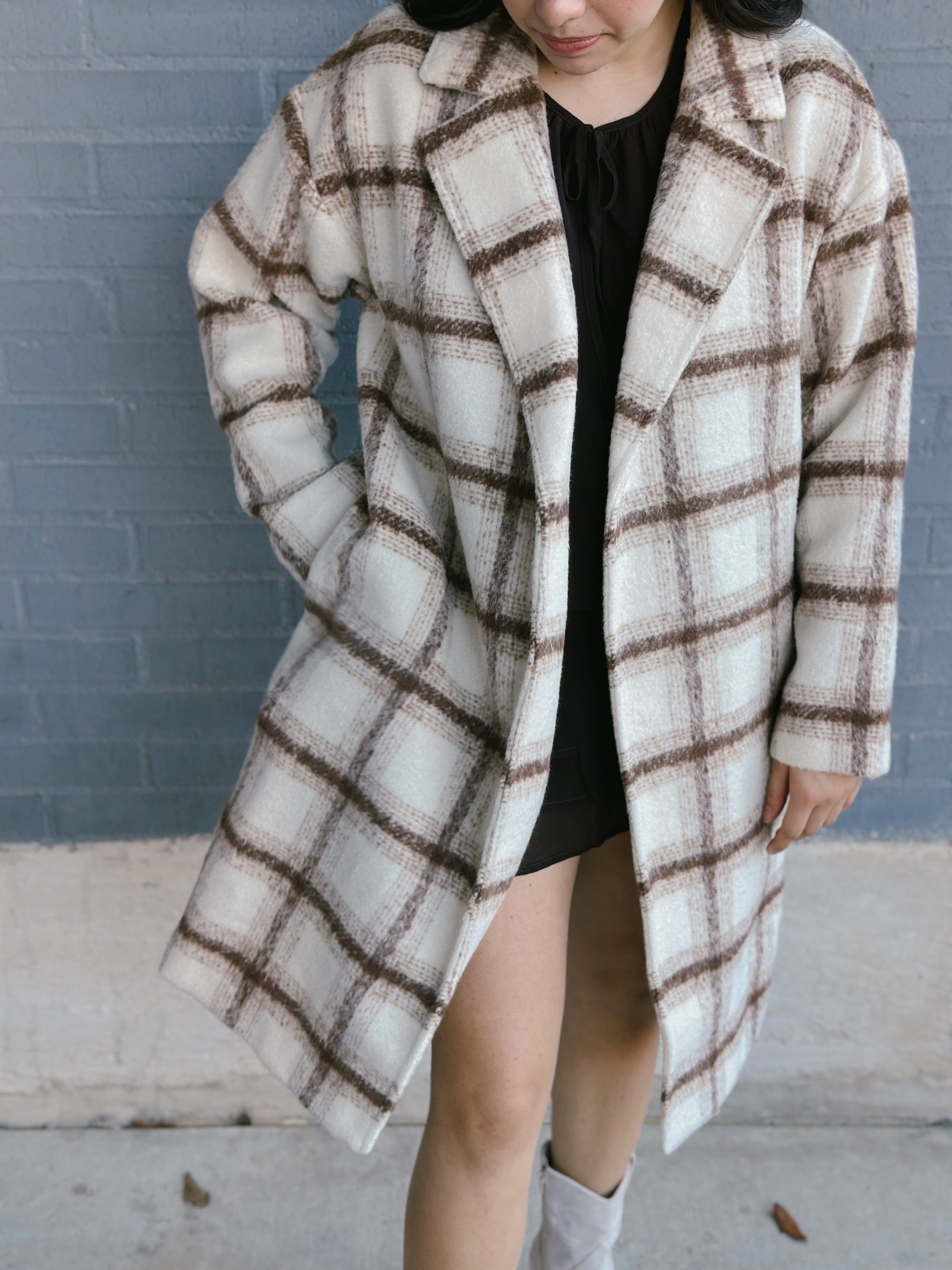 Introducing the Emily Coat—your new favorite layering piece! This chic open-front design flaunts a gorgeous ivory and medium brown two-tone palette that pairs with practically everything in your closet. The mid-length cut hits just right, while the luxe blend of 85% polyester and 15% wool keeps you cozy without the bulk. Effortlessly sophisticated, endlessly versatile—this is the coat that makes getting dressed fun.
