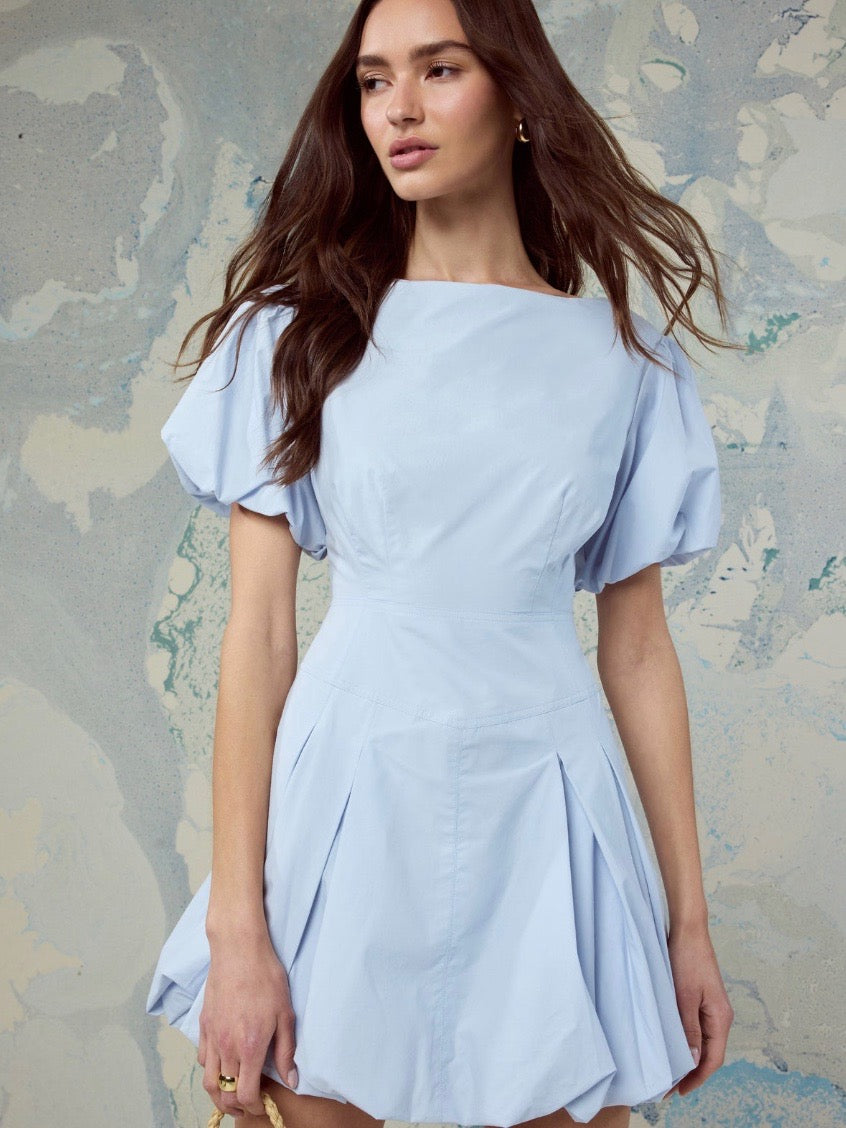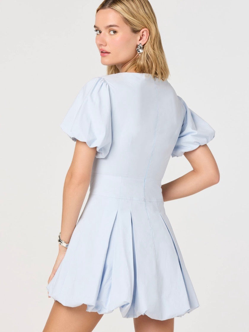 This puff sleeve mini dress features a playful bubble hem for a fresh, feminine feel. Designed for easy all day wear, it can be dressed up or down with ease.