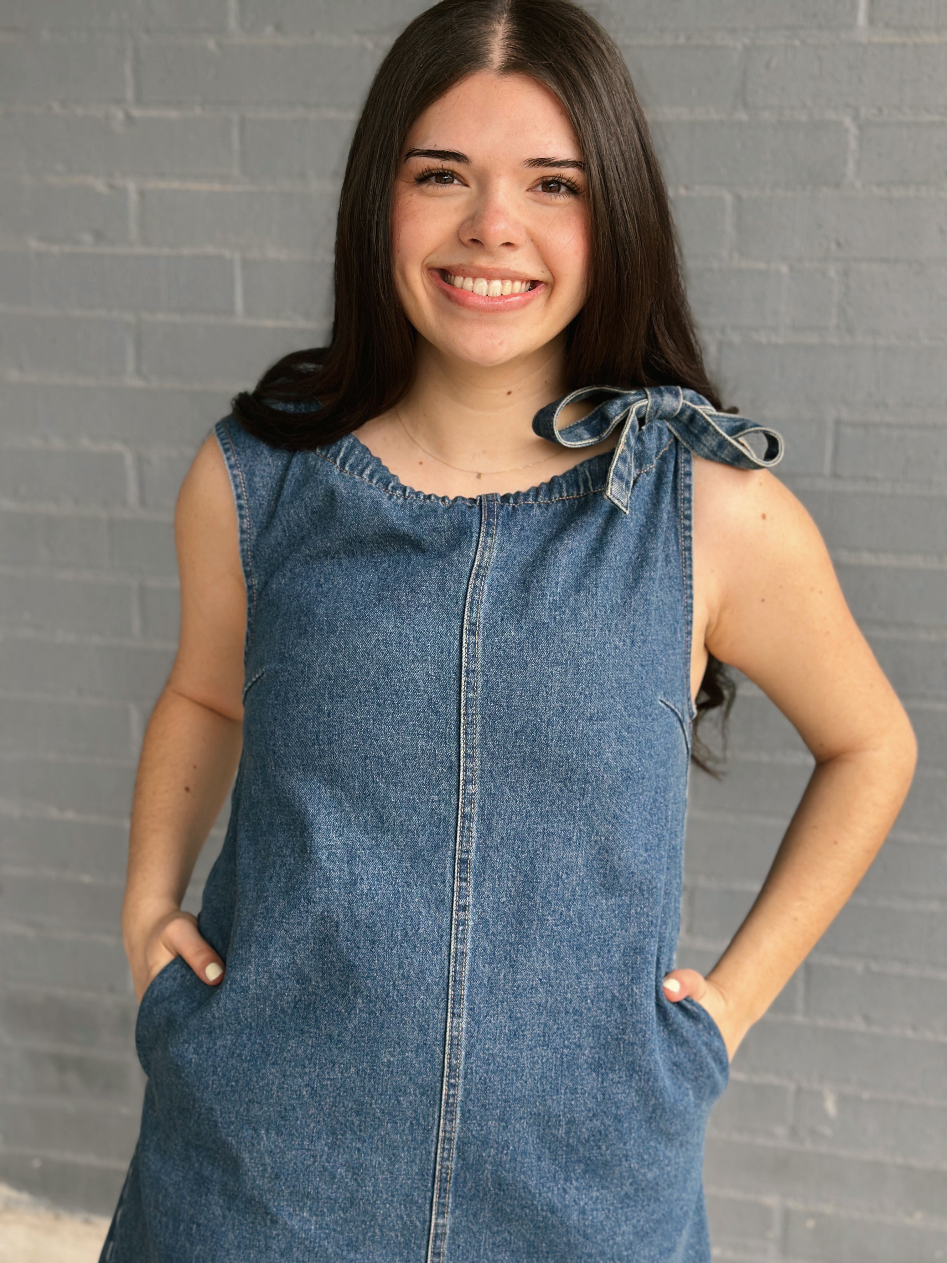 Slip into effortless style with this charming denim shift dress, complete with a playful bow detail that adds just the right amount of personality to your everyday look.