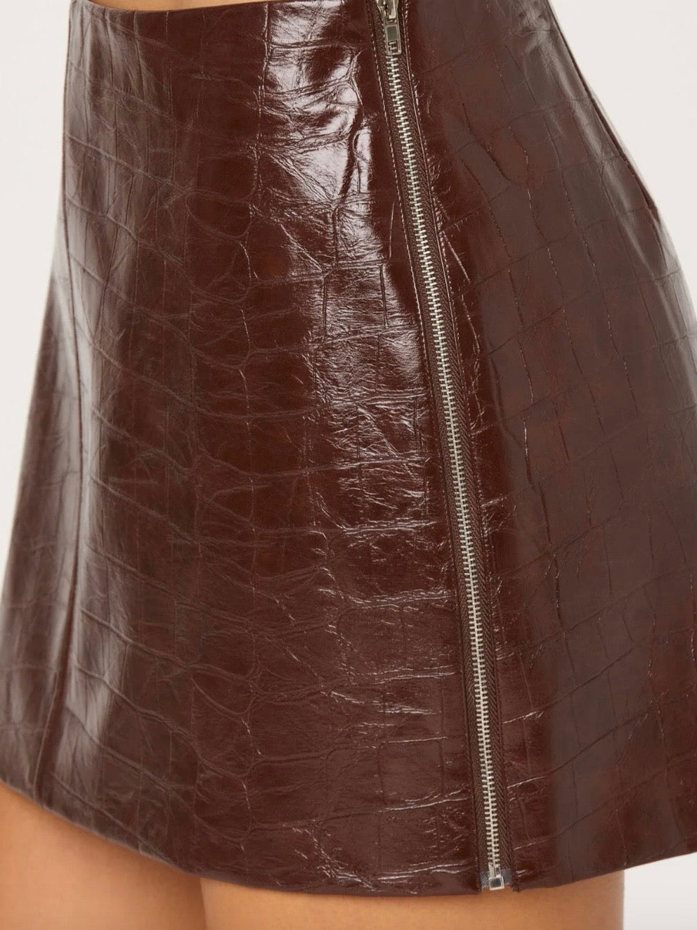 Structured and stylish, this faux croc leather mini skirt pairs well with a chic top for a refined, going-out or holiday party look.