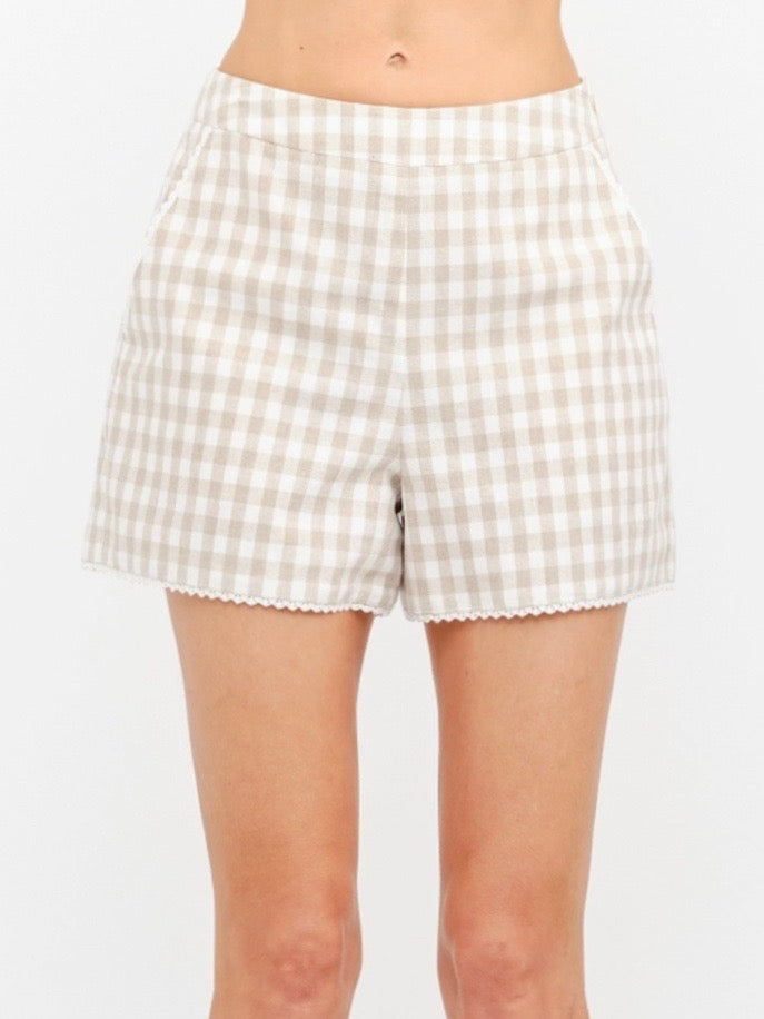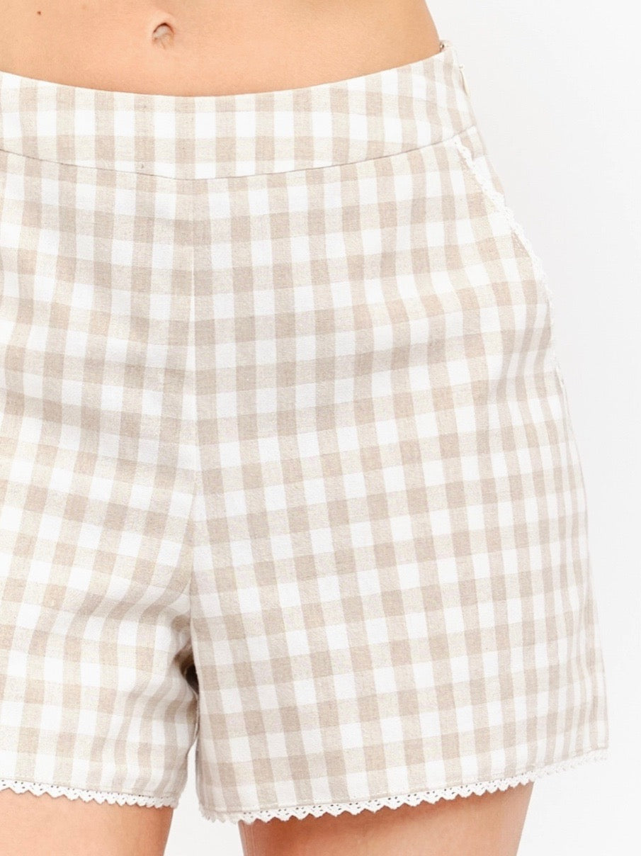 Sleeveless gingham tank featuring a softly cinched waist that creates a flattering, feminine silhouette. Designed with a clean neckline and lightweight feel, this top drapes effortlessly while offering subtle shape. Perfect for warm days, it pairs seamlessly with matching shorts or easy everyday bottoms.