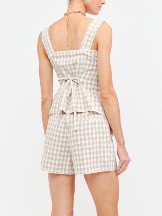 Sleeveless gingham top featuring a soft natural and ivory check pattern with delicate trim along the neckline and straps. Designed with a fitted silhouette, button-front closure, and a back tie detail that cinches the waist for a flattering, feminine shape with subtle structure.