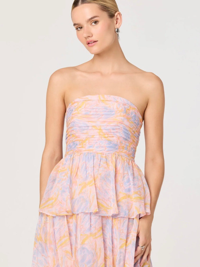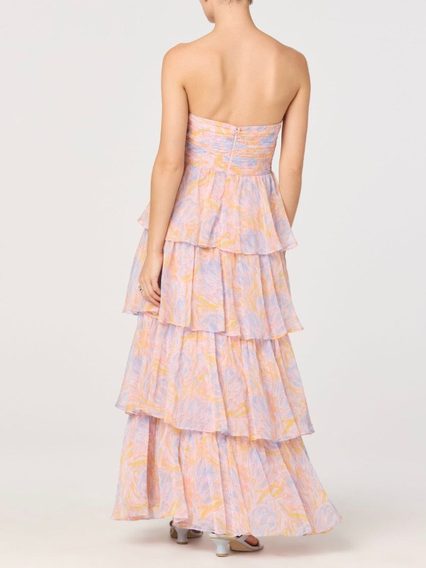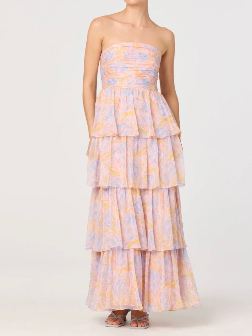 A strapless floral maxi dress finished with a tiered ruffle skirt for soft, romantic movement. Perfect for weddings, rehearsal dinners, and standout guest looks.