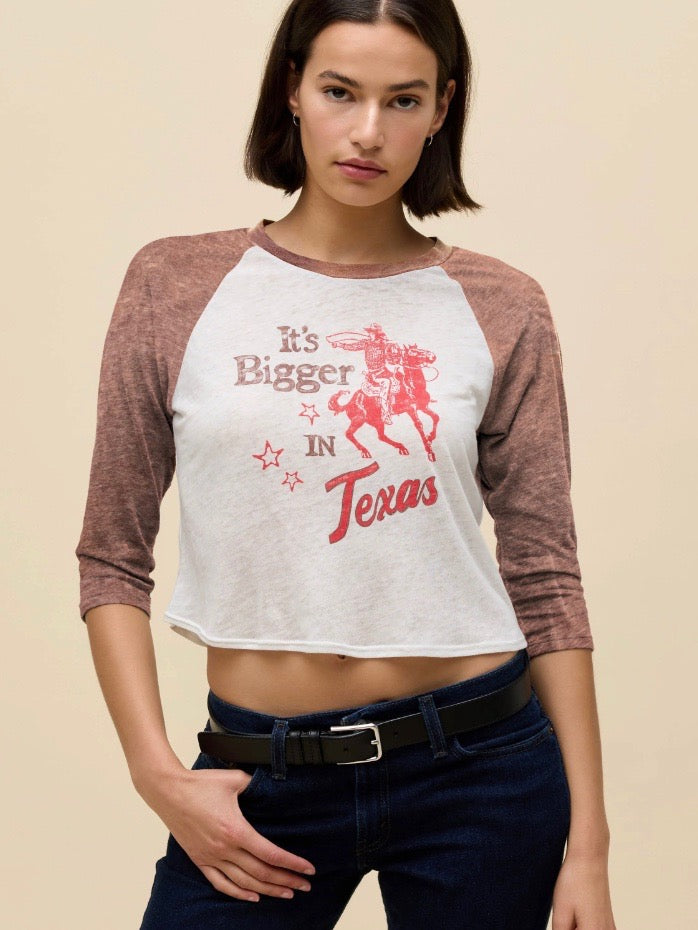 It's bigger in Texas. A cowboy graphic lands on this cheeky Raglan Tee inspired by the spirit of the West. Designed in a burnout fabric which features a high low pattern resembling the aging of a lived-in vintage tee.