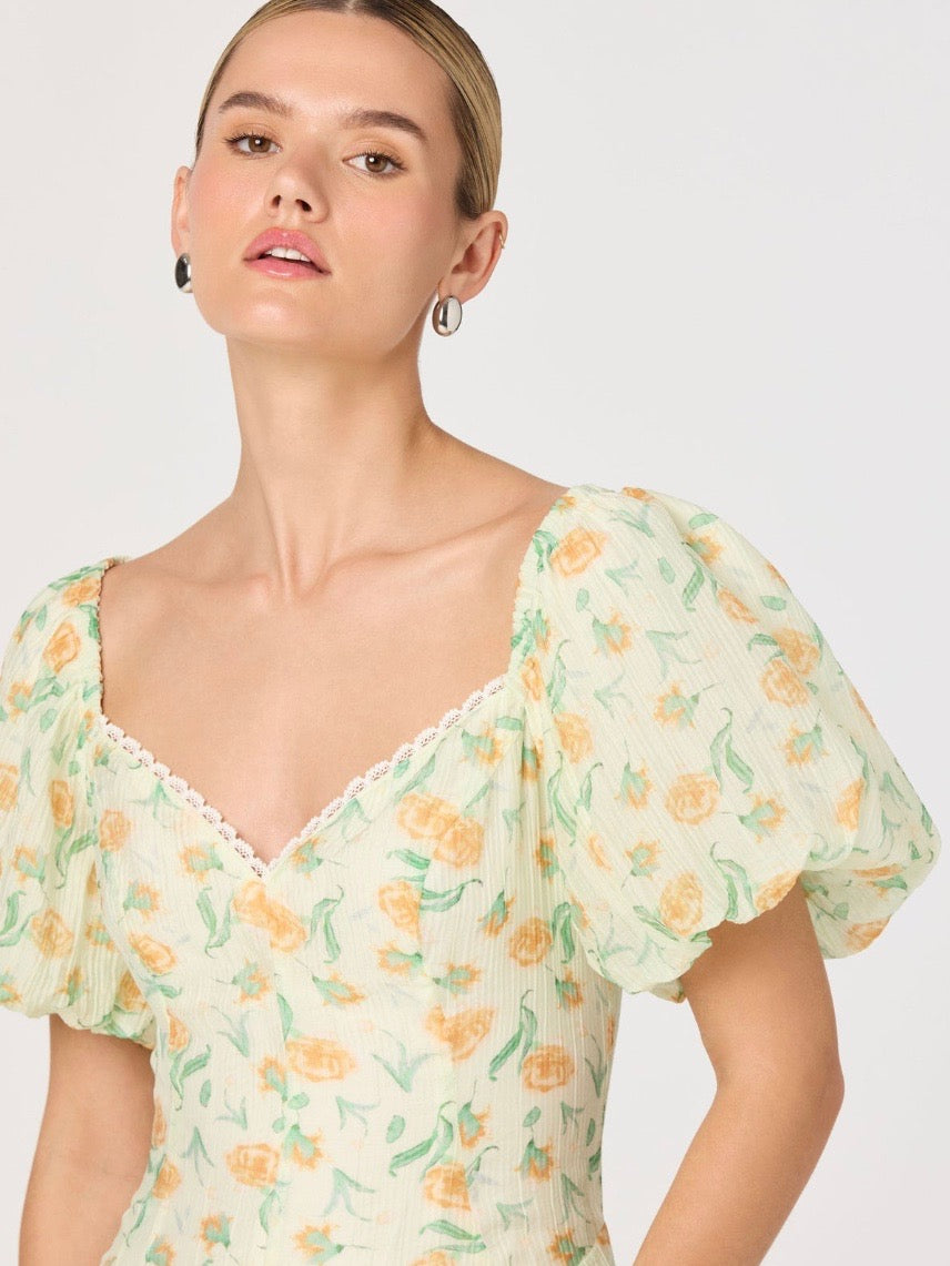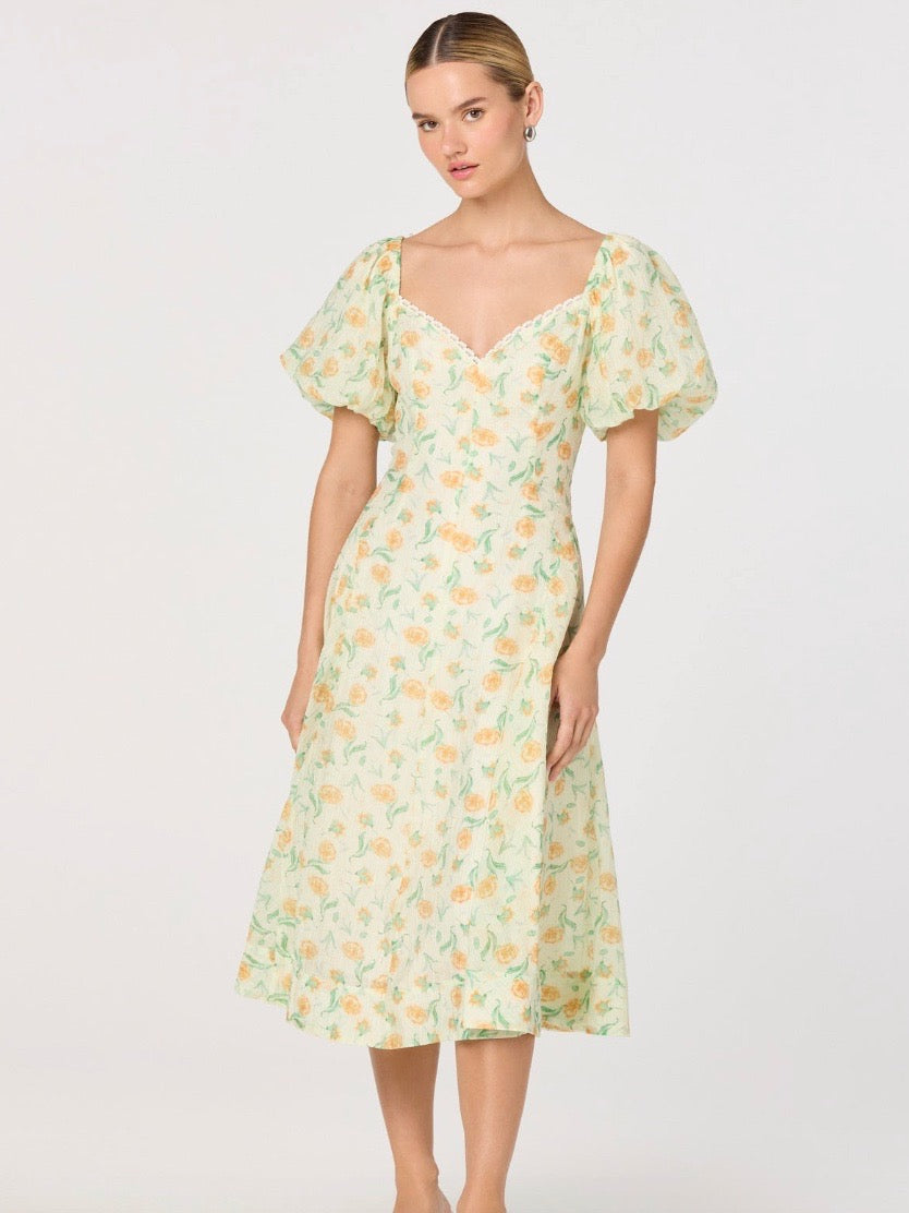 A floral print midi dress crafted in soft, airy crinkle gauze-like fabric with a lace trimmed v-neckline. Light, feminine, and versatile, it’s perfect for spring weddings, bridal showers, or an elevated day at the office.
