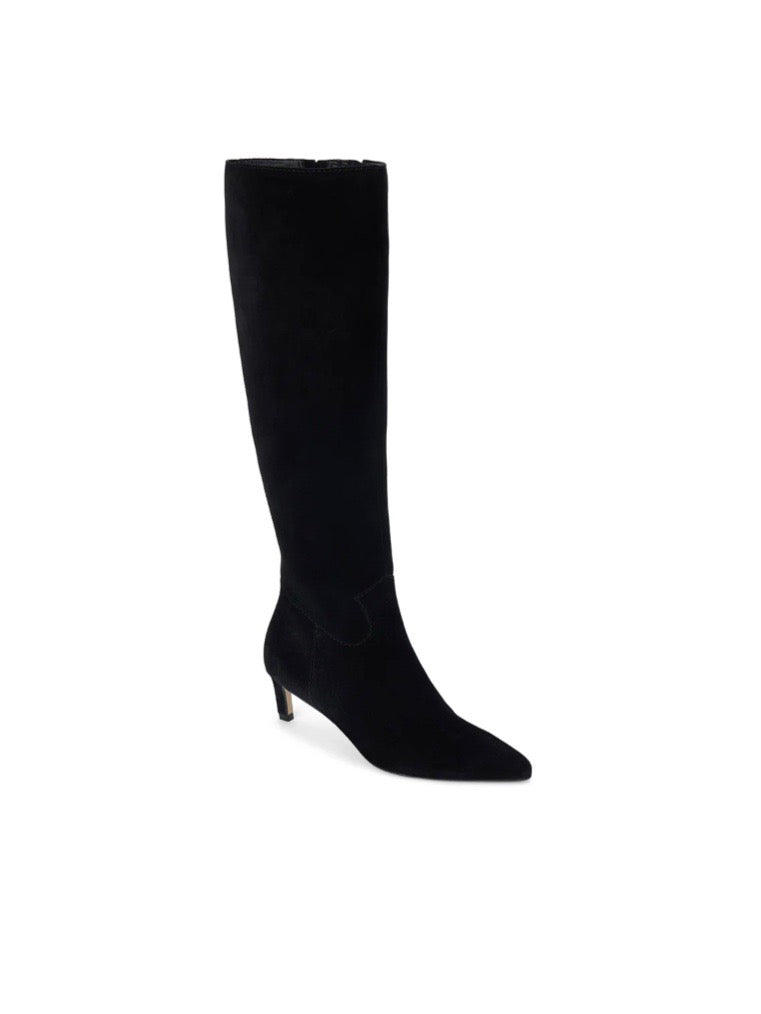 Black suede knee-high boot with pointed toe and low kitten heel.