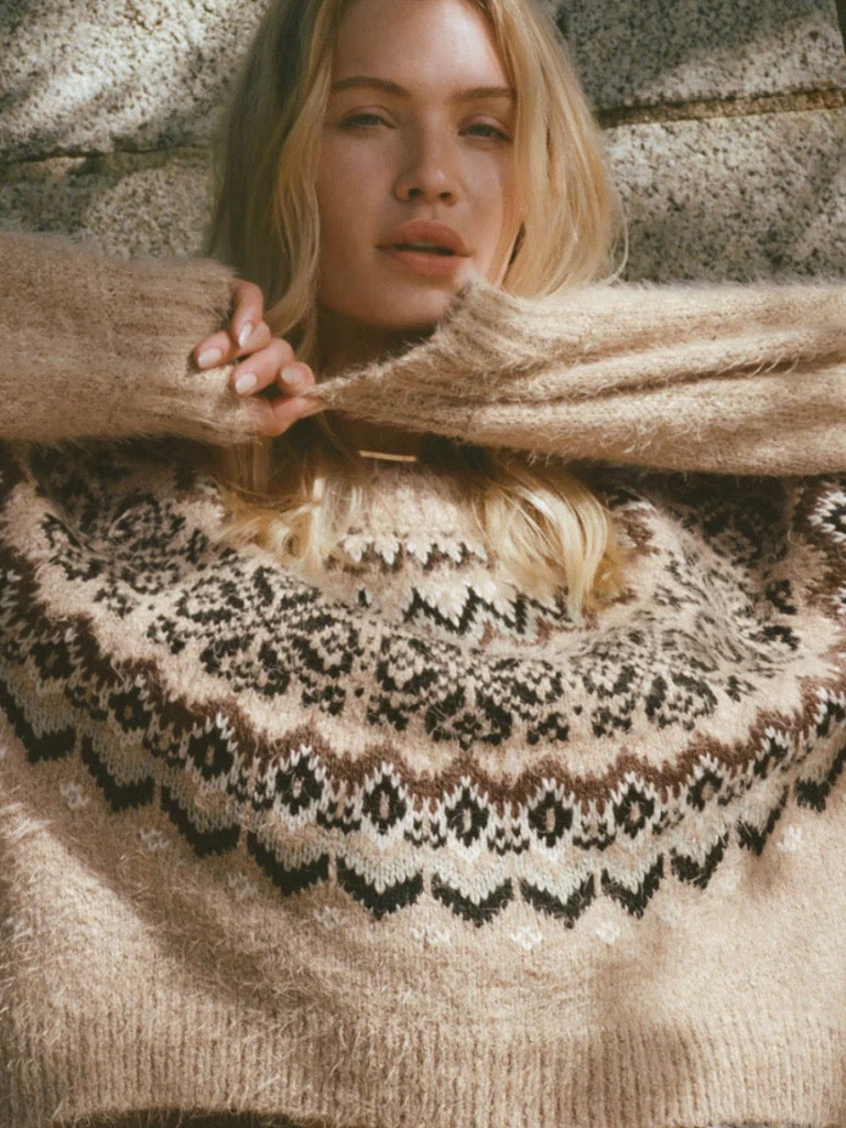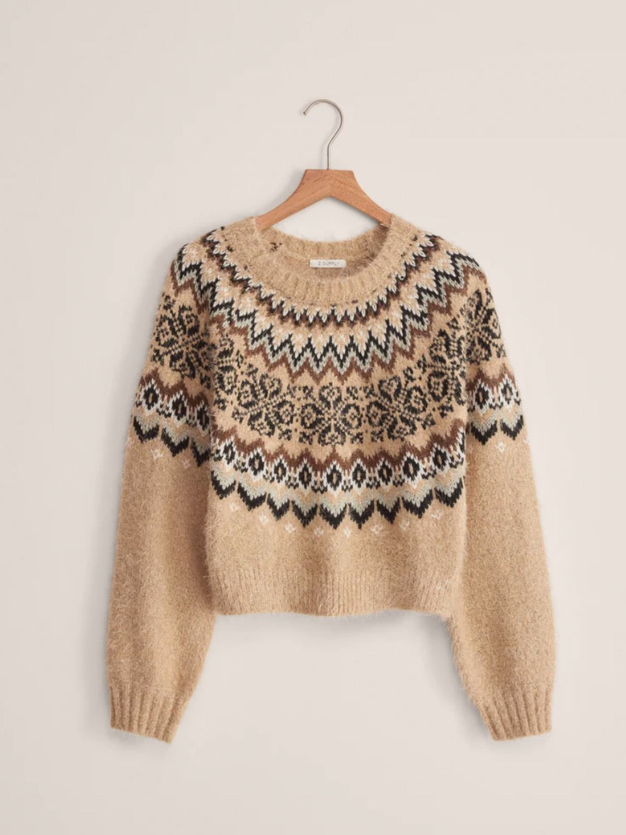 A whispy, feathered sweater knit brings an ultra-soft hand feel to this relaxed Fair Isle sweater. Designed with a crew neckline and easy drape, it’s the kind of knit that feels just as good on a snowy cabin morning as it does with denim.