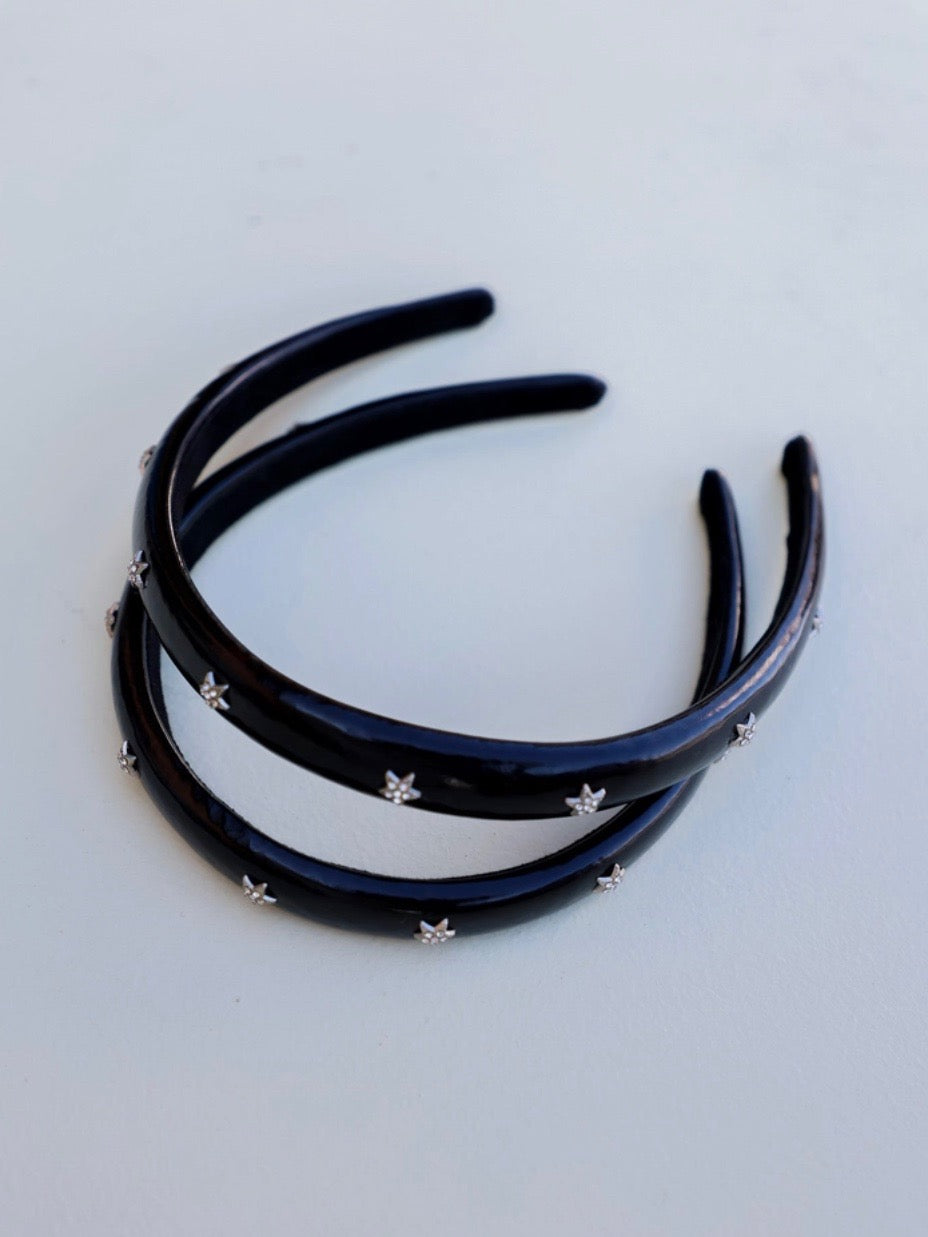 Sleek and celestial, this black headband is dotted with sparkling silver star studs for the perfect mix of edgy and glam. Whether you’re dressing up for a night out or adding a little shine to your everyday look, this piece is a star all on its own.