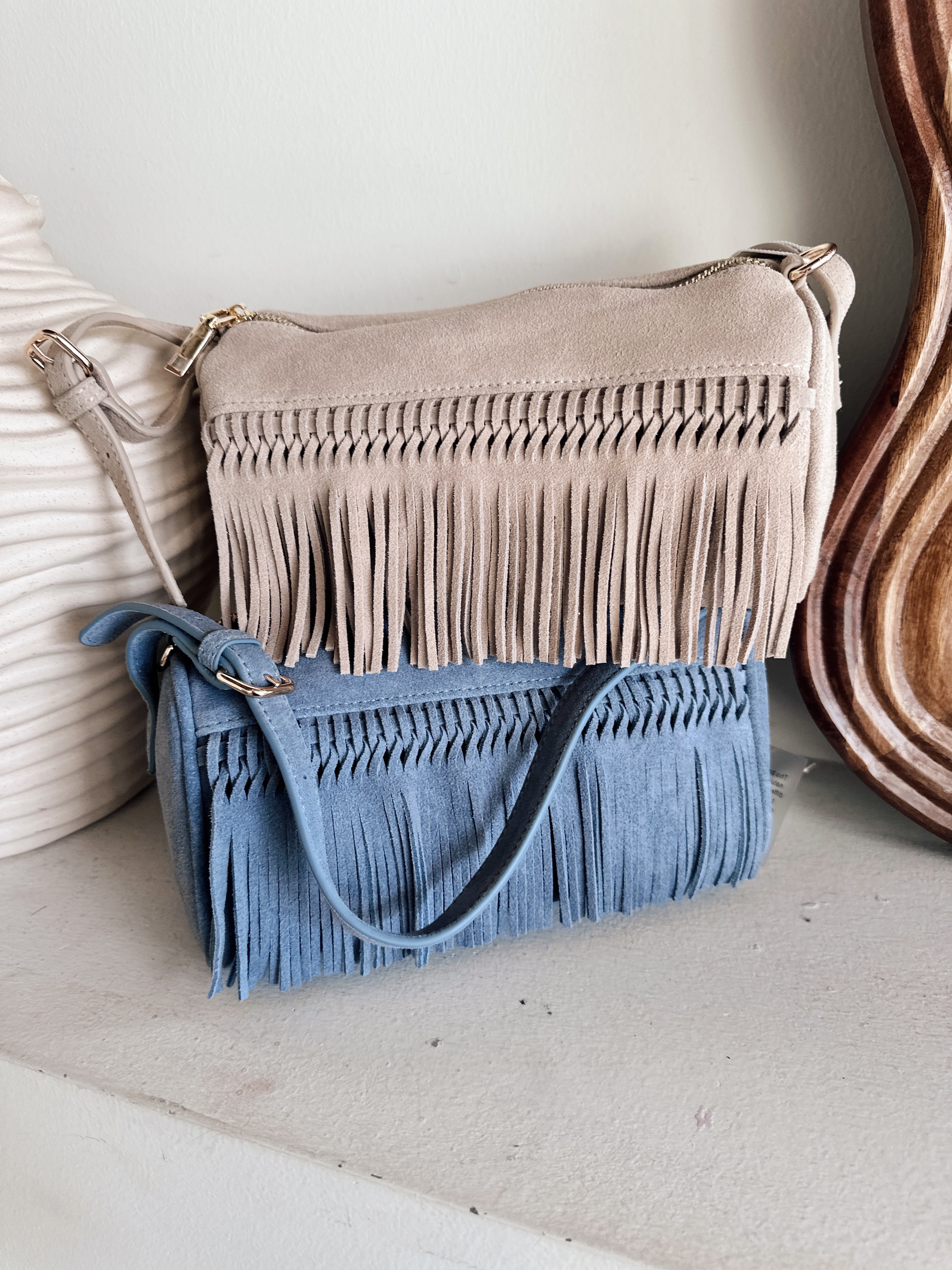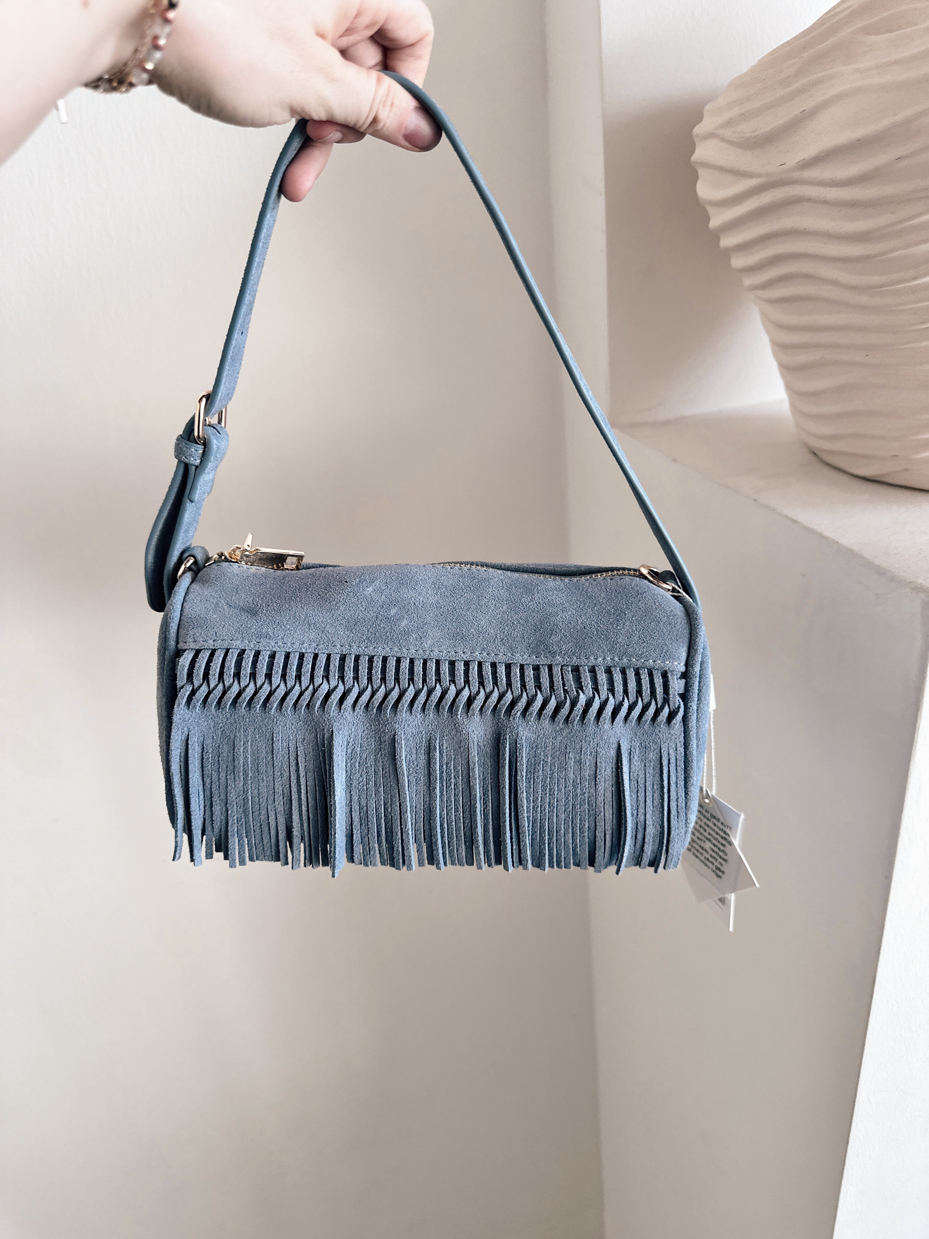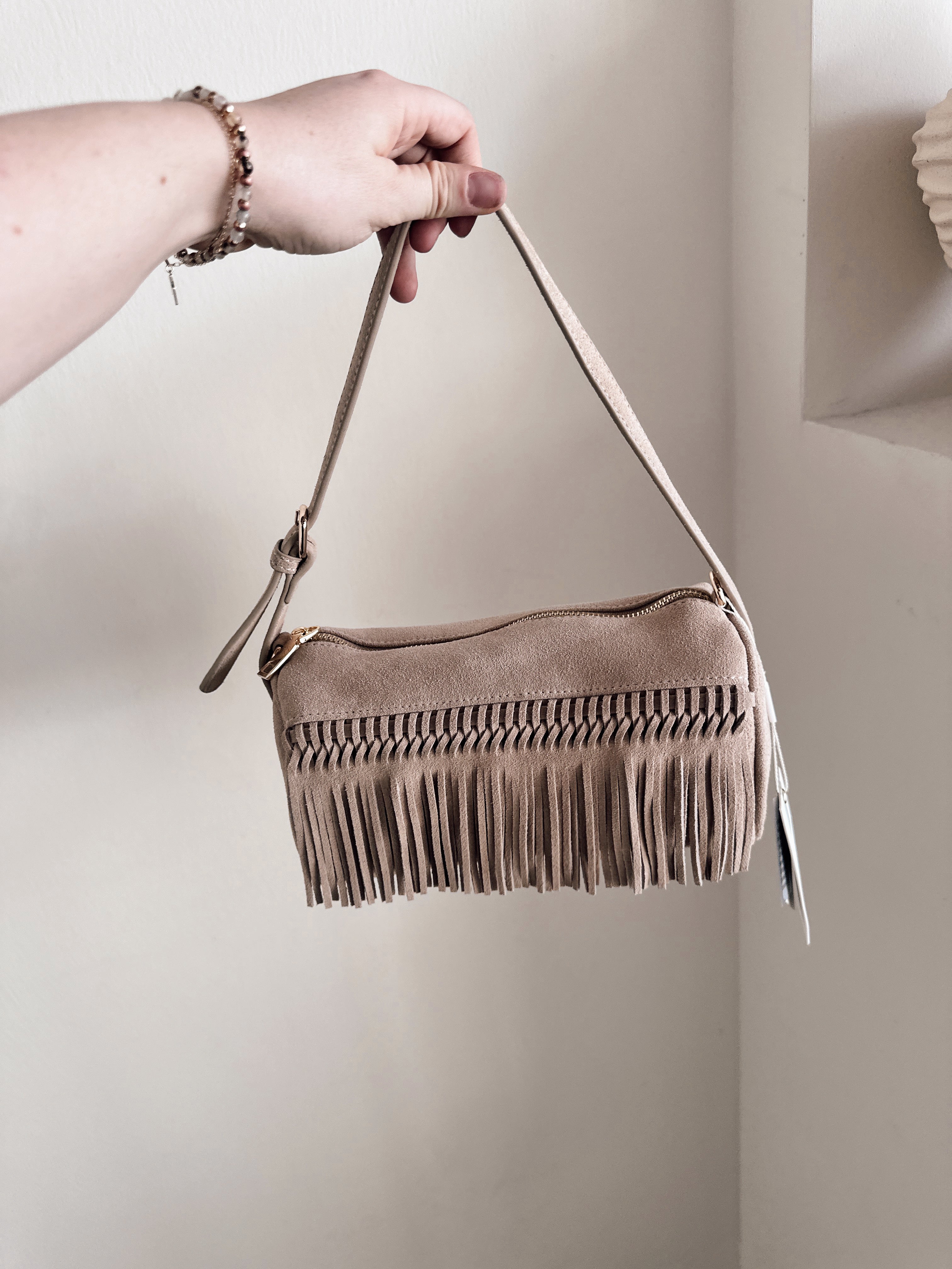 Emmi Shoulder Bag — compact suede cylinder with braided trim and fringe. Soft suede body, braided whipstitch detail, statement fringe across the front. Top-zip closure and exterior zip pocket for quick access, adjustable strap with buckle for versatile wear.