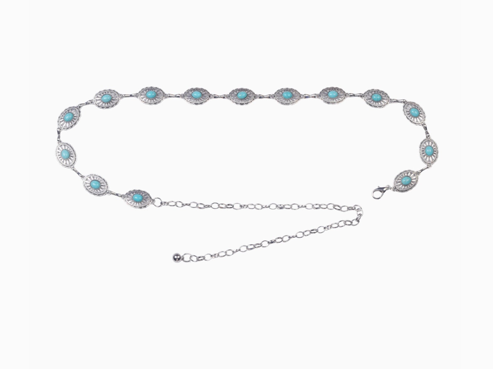 A subtle nod to Southwestern style, our Small Concho Chain Belt with Turquoise adds a pop of color and charm to any look. Featuring petite silver conchos accented with turquoise center stones and linked by a delicate chain, this belt brings a vintage-inspired, boho touch to denim, dresses, and skirts. Lightweight and adjustable for easy everyday wear.
