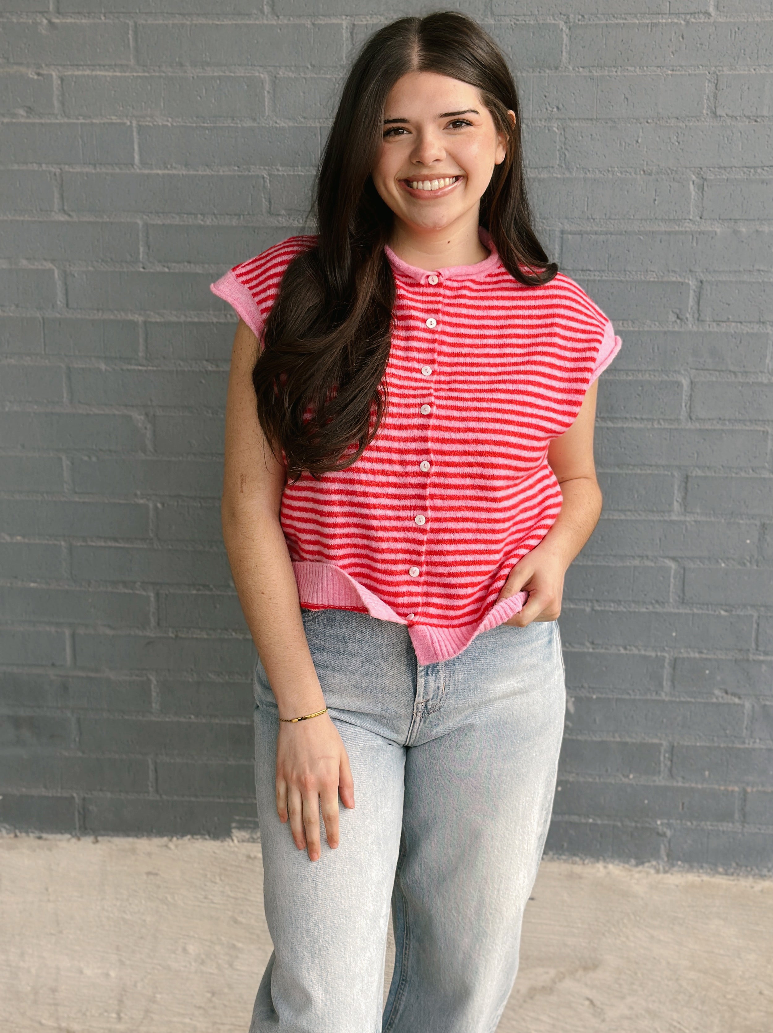 Layer up with effortless charm in this short-sleeve striped knit cardigan. Perfect for throwing over your favorite tee or dress, it adds instant personality to any outfit. The relaxed fit and playful stripes make it a go-to piece for casual days and weekend adventures. Cozy, versatile, and undeniably fun.