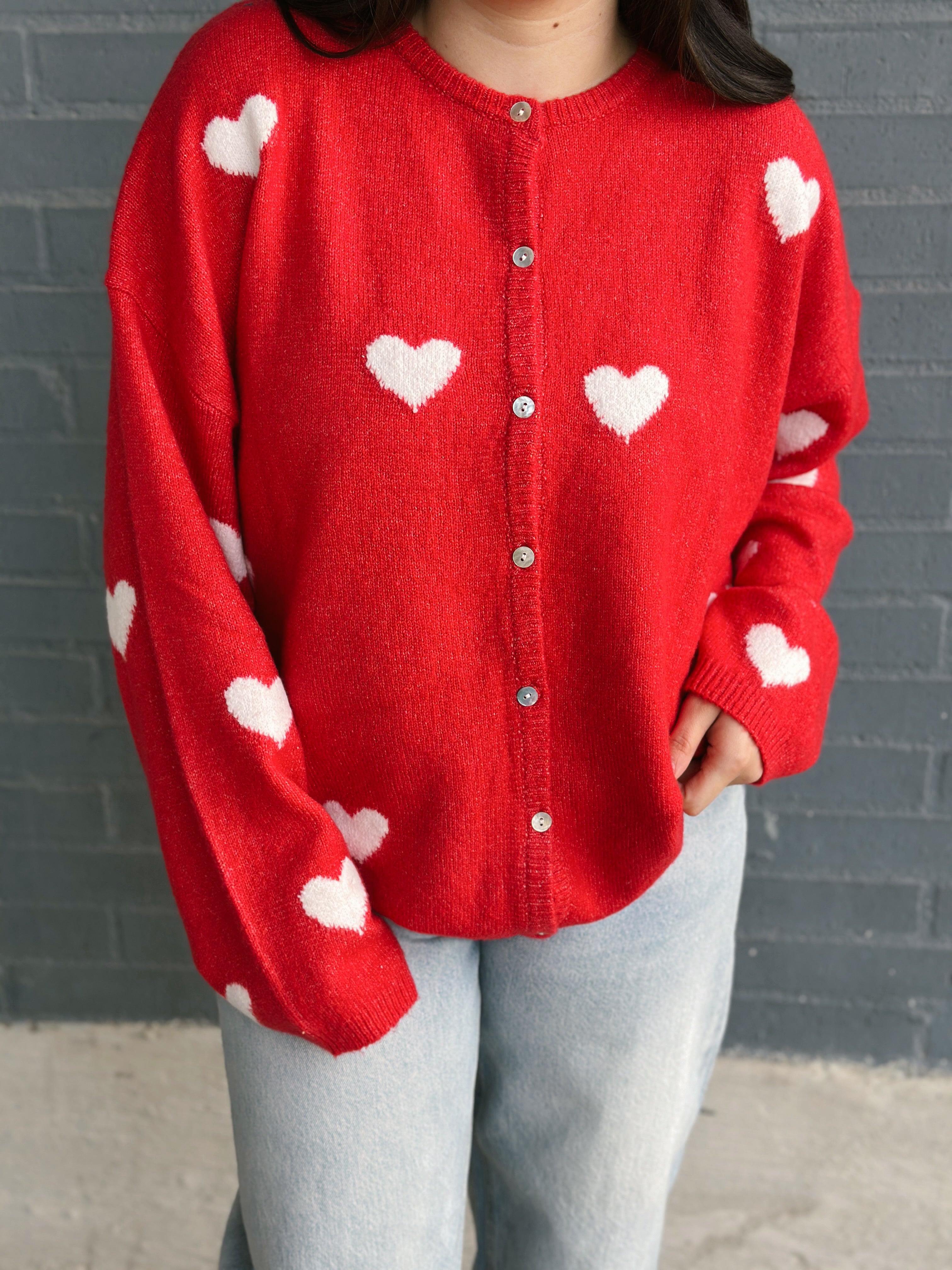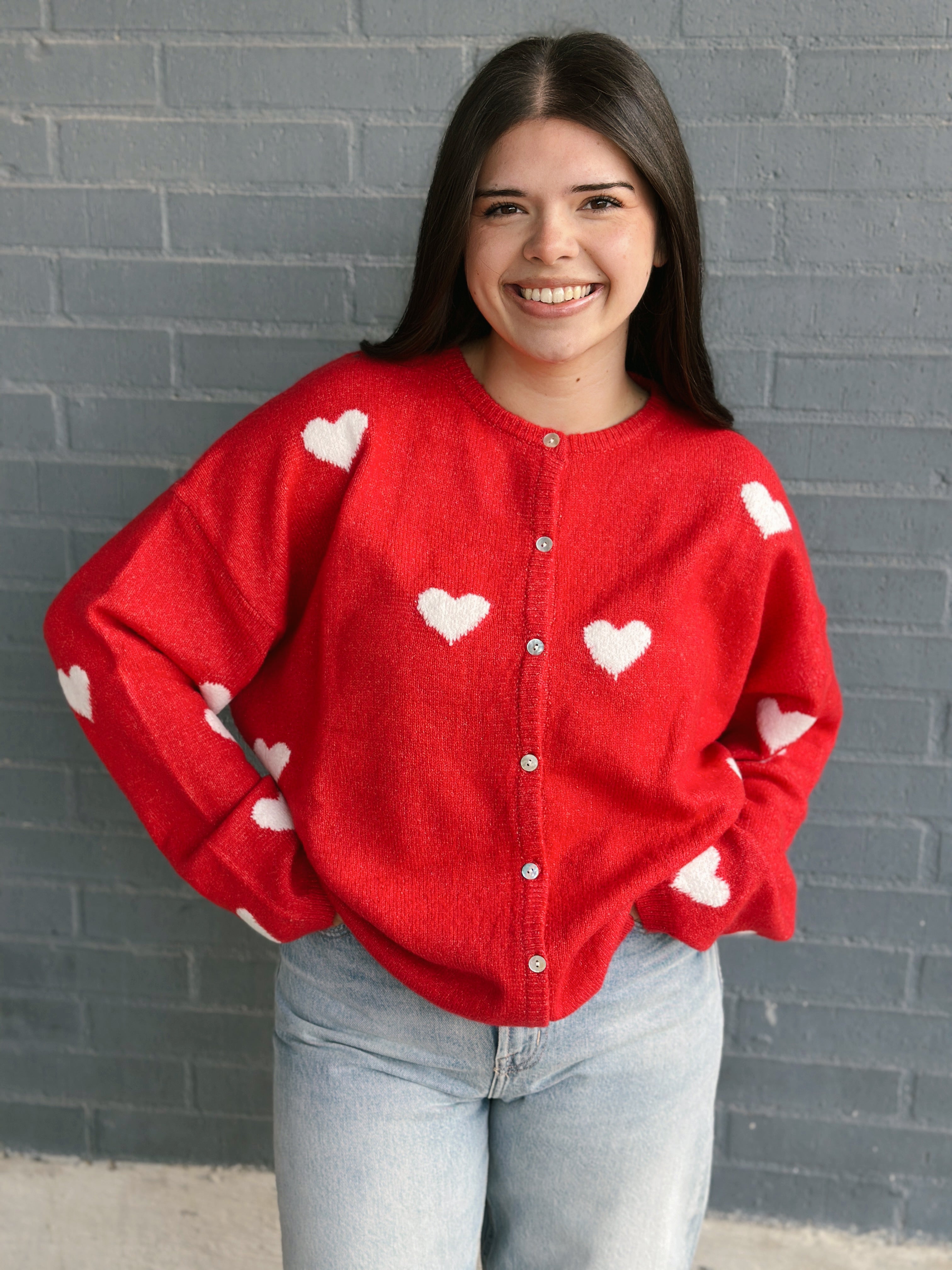 Wrap yourself in cozy comfort with this delightfully soft knit cardigan, featuring an adorable heart print that spreads joy with every wear.